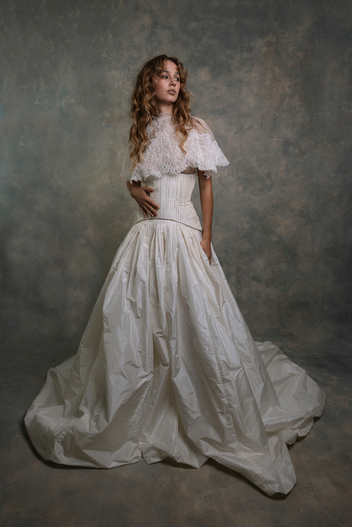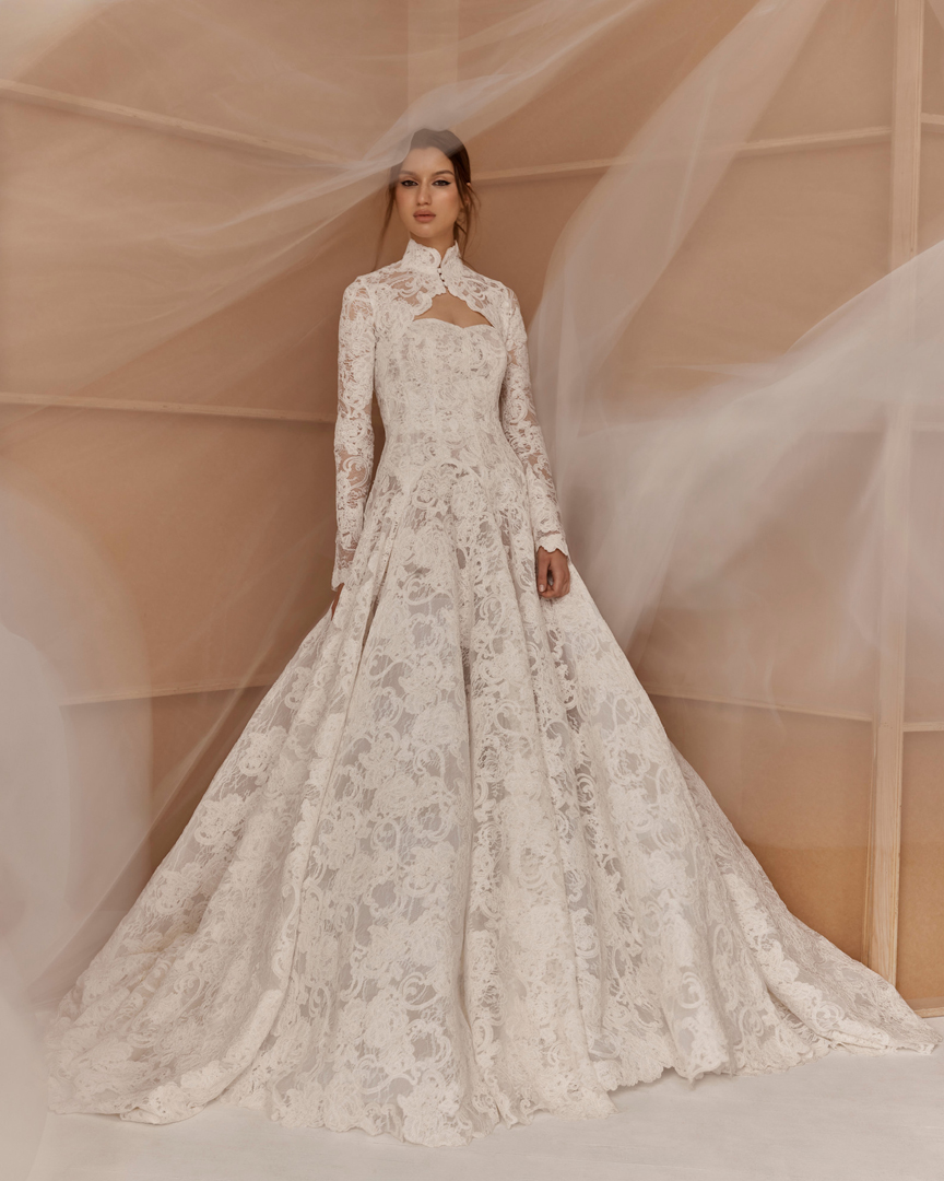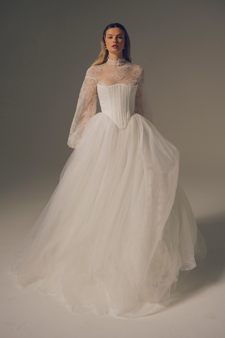 في مجموعة ماركة فرانشيسكا ميراندا Francesca Miranda لم تأت قصة الكورسيه منفصلة عن التنورة مثل أغلب الموديلات التي صادفناها في مجموعة خريف وشتاء 2026، فقد اتصلت بالتنورة المنسابة على الجسم وزودت من أعلى بتوب طويل أكمام مرتفع الياقة ليحاكي ذوق عروس ترغب في إطلالة محتشمة، اكتفي بتنسيقه مع أقراط Studs مرصعة باللؤلؤ والألماس، وانتعلي حذاءً مدبباً مصمماً من الدانتيل المرهف.