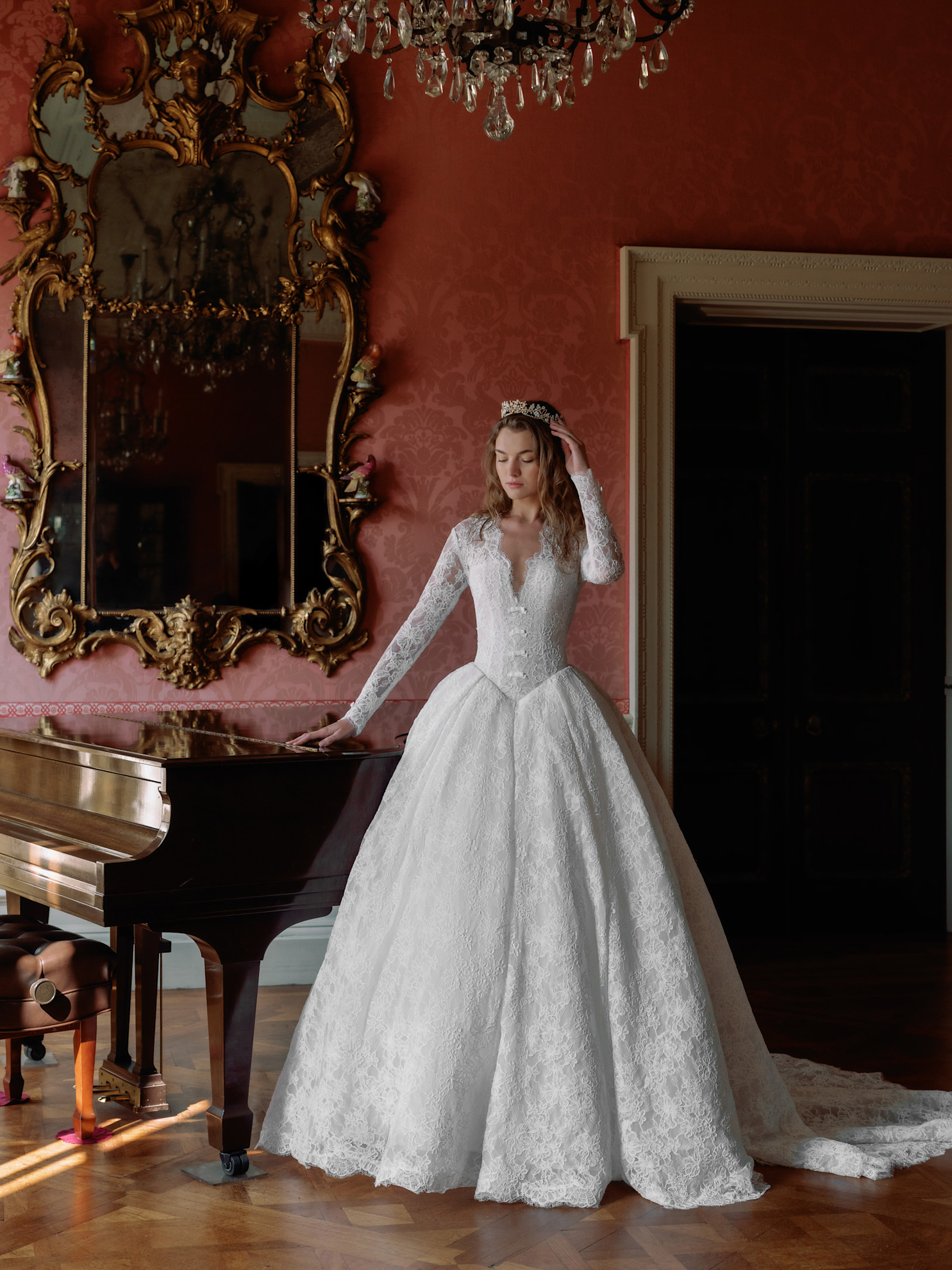 تتنوع أشكال وخامات فساتين الأعراس الكورسيه، فقد امتلأت مجموعات خريف وشتاء 2026 بعشرات الموديلات، ولكن أكثر ما لفتنا الحضور الطاغي للموديلات منخفضة الخصر، والتي أزاحت الخصر العالي عن عرش الموضة، وقد برعت أسماء بعينها في تصميمها، فأحببنا الفستان المصمم بحمالات وتنورة طبقات مكشكشة من ماركة جاستن ألكسندر Justin Alexander، والذي جاء منسقاً مع قفازات الأوبرا الطويلة، ابرزي جماله بأقراط طويلة وعريضة مرصعة بالألماس، وانتعلي حذاء Slingback.