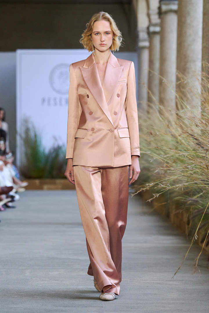 كانت البدلات الساتان واحدة من أبرز الصيحات التي حققت انتشاراً واسعاً منذ أعوام قليلة قبل أن يخفت نجمها، ولكنها تسجل عودة قوية على منصات ميلانو خاصة أنها قدمت بألوان باستيلية حالمة لدى ماركة بيسريكو Peserico، فأعجبتنا إطلالة العارضة بالبدلة الوردية الفاتحة المزودة بأزرار على الجهتين ومميز بالجاكيت الطويل عريض الياقات المنفذ على طراز السبعينات.