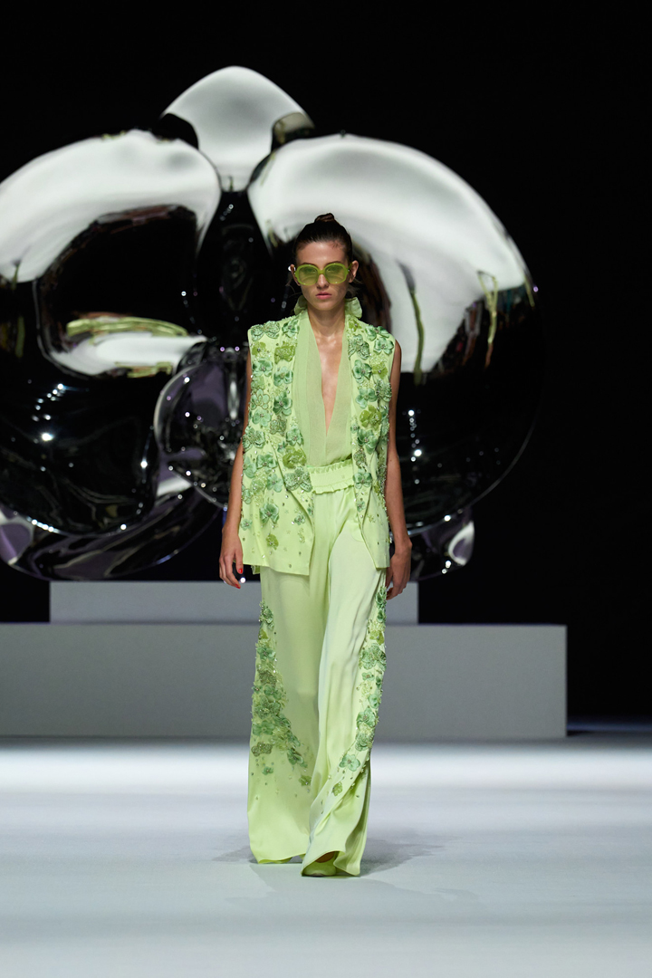 تزهر الورود كحدائق غناء على البدلات في 2026 لتثبت أن الطبيعة ستظل مصدر الإلهام الأقوى لكبار المصممين، واللافت هو تطبيقها بدقة متناهية تضاهي أزياء الكوتور، فقد لمسنا هذا الإتقان في عرض ماركة جيني Genny، فقد خطفت إحدى العارضات الأنظار ببدلة فخمة مصممة باللون الأخضر الليموني ومن دون أكمام ازدانت بورود ثلاثية الأبعاد من اللون نفسه، وهي خيار عصري فخم للتأنق في السهرات الربيعية.
