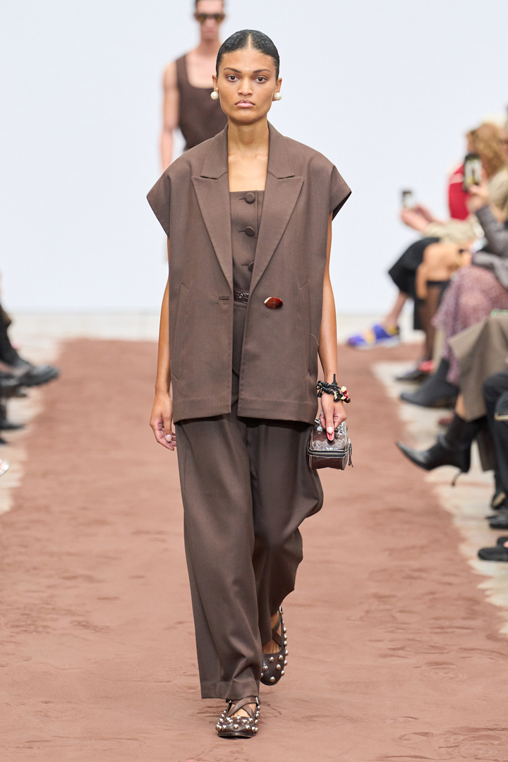 أكدت مجموعات ربيع وصيف 2026 على لا محدودية الإبداع لدى الإيطاليين، فأغلب الأفكار كانت خارج الصندوق تتراوح بين وسطين، فالبدلات على سبيل المثال لم تكن بأكمام طويلة ولا حتى من دونها، فرأينا موديلات بأكمام الكاب القصيرة المرتبطة في أذهاننا بستايل فساتين الخمسينات لدى دروف كابور Dhruv Kapoor، والأجمل أنها نفذت بأسلوب عصري، فكانت السترات بقياس كبير Oversized وزودت بزر أحمر أظهر جمال اللون الترابي المستوحى من الشوكولاتة، البدلة التي تألفت من ثلاث قطع من ضمنها الصديري القصير الرائج، يمكنك تنسيق كل قطعة فيها على حد سواء في الإطلالات الكاجوال النهارية أو حتى في المساء.