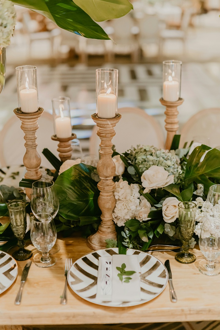 تزيد حاملات الشموع الخشبية ذات الطابع الريفي الملمس والدفء على أي طاولة زفاف؛ يُمكن للعروس تنسيق هذه الأنواع من الشمعدانات، مع شموع بيضاء بسيطة لإطلالة كلاسيكية. أما إذا كان الطابع العام في حفل الزفاف أكثر حيوية، فجربي الشموع باللون الأحمر الداكن أو البرتقالي المحروق، ويضيف مزج أشكال وأحجام مختلفة من حاملات الشموع الخشبية ببعضها تأثيراً بصرياً متعدد الطبقات.
