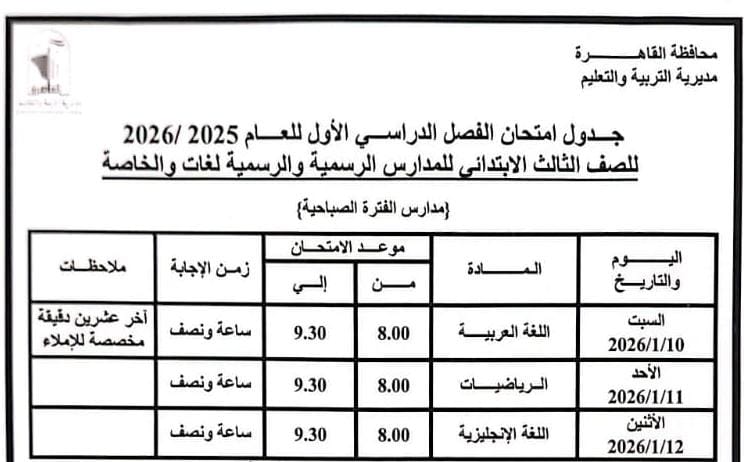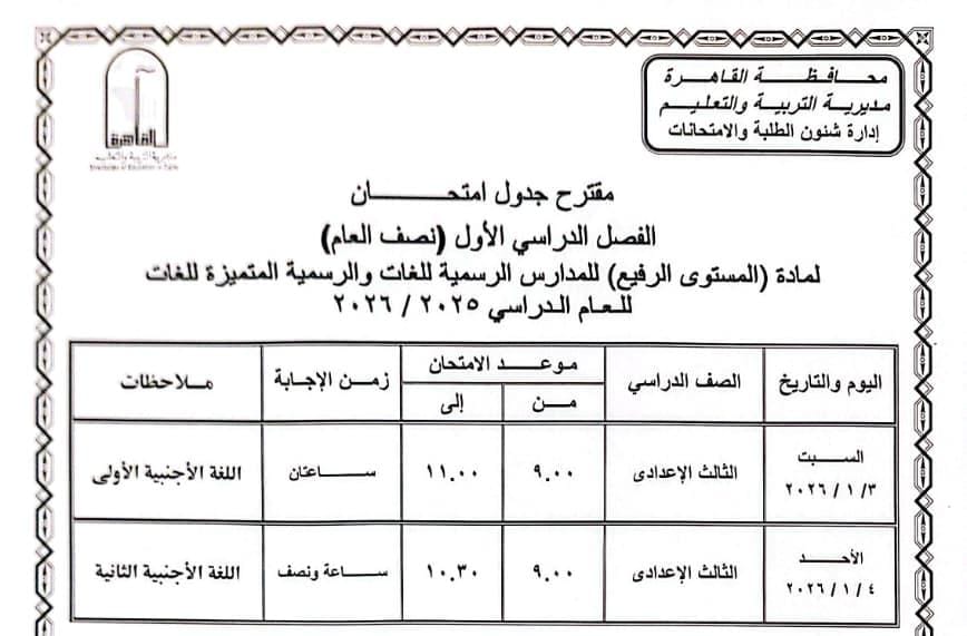 الجدول الجديد يراعي مواعيد المواد الأساسية والثانوية، ويمنح الطلاب فرصة كافية للمراجعة بين المواد، بما يتناسب مع طبيعة كل مرحلة دراسية، كما تم التأكيد على أن الامتحانات ستبدأ في الأسبوع الثاني من يناير 2026، وهذا للمواد المضافة للمجموع، وتستمر حتى نهاية الشهر، مع التشديد على الالتزام بالإجراءات التنظيمية داخل اللجان، كما أن المدارس الحكومية التجريبية سوف تقوم بأداء امتحان المستوى الرفيع قبل بداية الامتحان في المواد الدراسية الأساسية.