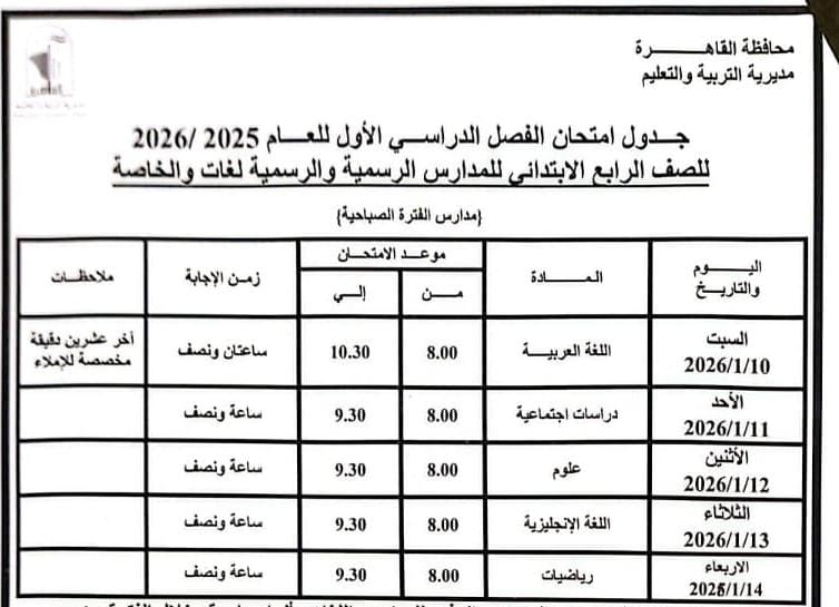 تبدأ من 3 يناير.. جدول امتحانات نصف العام الدراسي 2026 لجميع الصفوف الدراسية