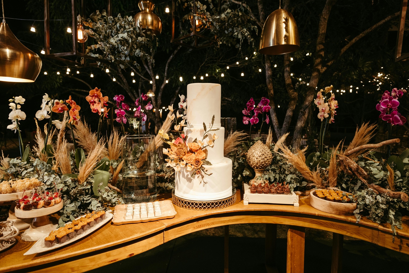 - ضعي كعكة زفافك على أعلى حامل في منتصف طاولة الحلويات لتكون بمثابة نقطة محورية. واتركي مساحة كافية من كل الجوانب حول حامل الكعكة الرئيسية ليتمكن الضيوف من الاستمتاع بتفاصيل التصميم من دون عوائق. ثمّ، رتّبي الحلويات على شكل نصف دائرة حول كعكة زفافك لخلق أنماط انسيابية طبيعية، فهذا التصميم يُوجّه أنظار الضيوف من القطعة المركزية إلى الحلويات المحيطة. واستخدمي الإضاءة بشكل مُدروس خلف الكعكة لخلق توهج ناعم يُبرز معالمها. في هذا الإطار، تُضفي الأضواء الصغيرة أو أضواء السلاسل دفئاً من دون أن تُطغى على العرض.