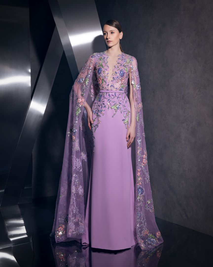 الليلكي الفاتح هو أحد درجات اللون الأرجواني. وهو لون الخزامى أو اللافندر، ويمكن وصفه بأنه أرجواني فاتح. يُمثل إحدى درجات الباستيل الترابية الهادئة التي تمتزج مع البشرة الداكنة؛ مما يضمن لكِ إطلالة أنيقة وجذابة على الرغم من بساطته. اشتري فستاناً ليلكياً فاتحاً الآن من تصميم زياد نكد يتصل بكاب مطرّز فوقه.