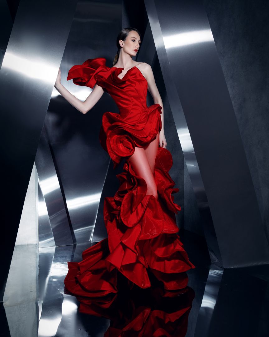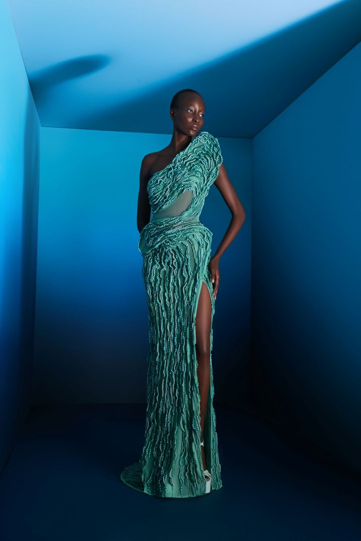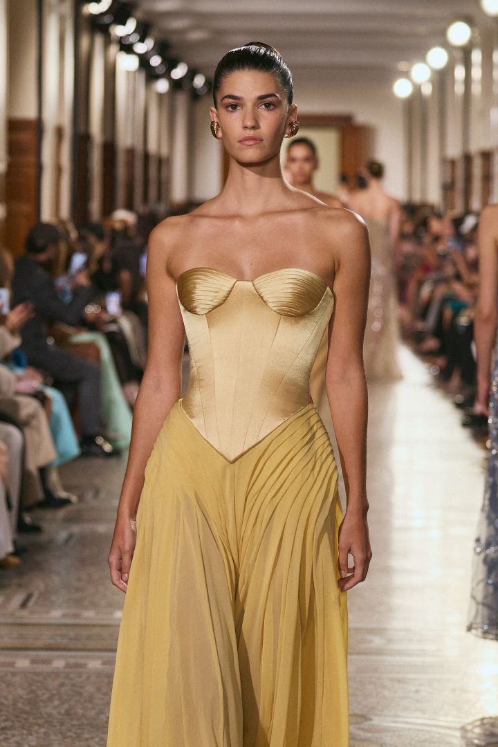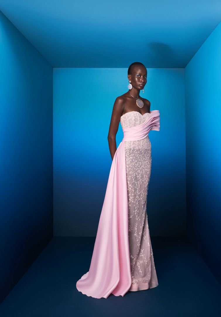 يتصدّر اللون الأصفر الهادئ قائمة ألوان فساتين السهرة التي تُناسب النساء ذوات البشرة الداكنة. إنه لون دافئ يُبرز جمالكِ، ويجعلكِ تبدين أكثر إشراقاً، ويعزز حيوية بشرتكِ. وكلما كانت بشرتكِ داكنة، بدت الألوان الصفراء الباستيلية أو الخردلية أو الكريمية، الأنسب لكِ، كما في عرض المصمم جورج حبيقة.
