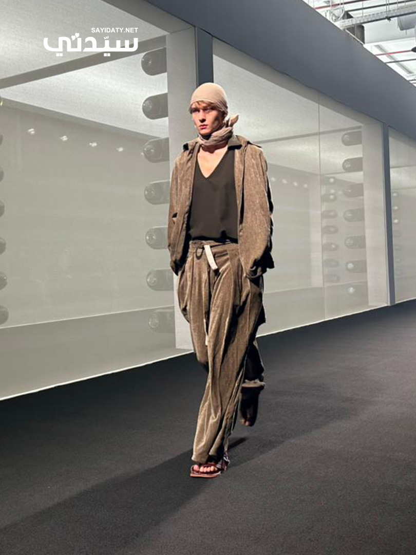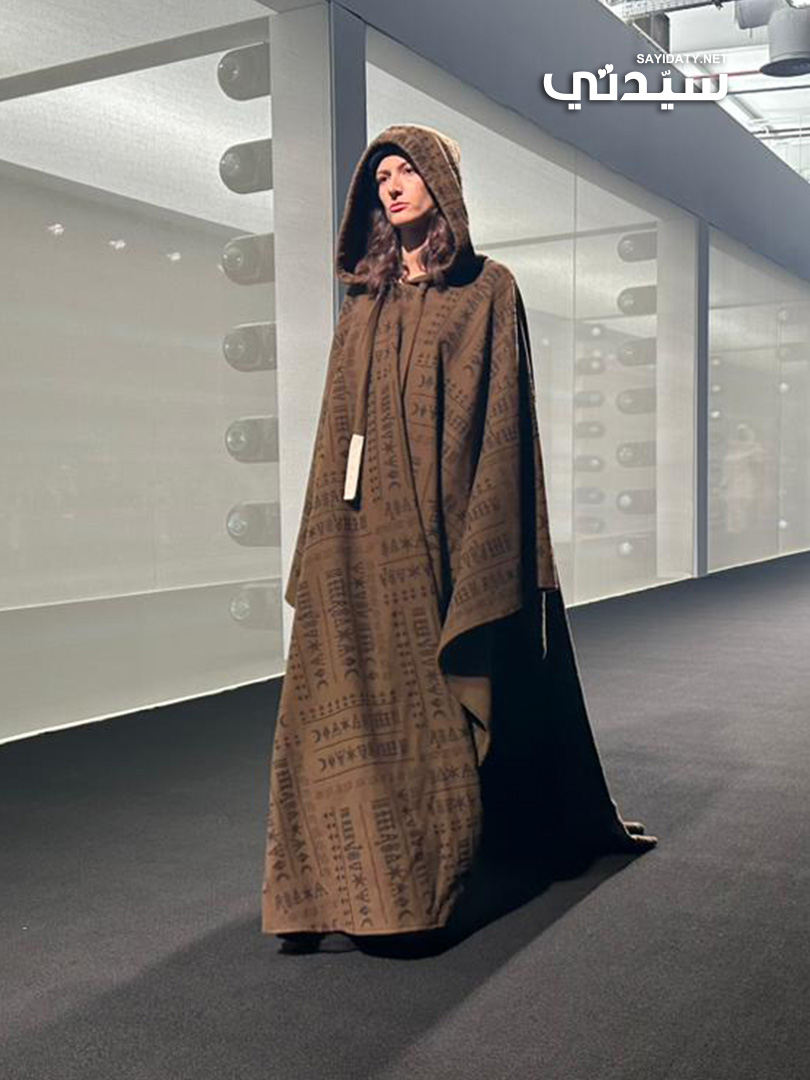 لم تخل المجموعة من إشارات واضحة إلى الهوية والتراث، فظهرت قطعة بارزة عبارة عن معطف طويل بغطاء رأس Hooded Cloak بلون بني ترابي داكن، يحمل نقوشاً رمزية مكررة، ما يعكس طابعاً درامياً وقوياً مستوحى من أزياء المنطقة التقليدية أو البدوية، ويجسد عمقاً فنياً واضحاً.