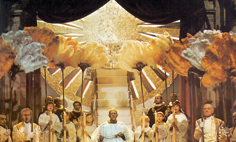 ثم ينتقل فيليني إلى عمق المؤسسات العريقة في مشهد “عرض أزياء الكنيسة”، وهو المشهد الذي يمثل ذروة رؤيته. تتحول روما في هذا المشهد إلى مسرح طقسي، حيث ترتدي الراهبات والقساوسة أزياء غريبة ومضيئة. يمزج فيليني هنا ببراعة بين التاريخ والعبثية، مؤكداً أن روما تدير أرواح البشر من خلال الإبهار البصري.