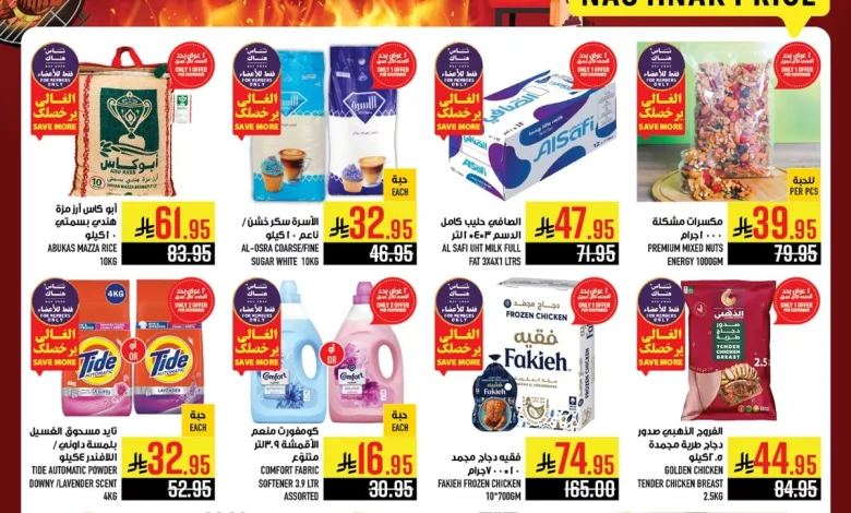 عروض أبراج هايبر ماركت الأربعاء 28/05/1447 تبدأ بالأجهزة المنزلية التي تضم غلايات حرارية كبيرة ومقالي كهربائية ومحضرات خلط وقدور طهي و غيرها و بتوفر كمان تشكيلة من المنتجات الغذائية منها الخضروات و الفلفل والبطاطس والطماطم الك الفواكه و تضم مجموعة من اللحوم والاسماك الطازجة و الاجبان و المجمدات .