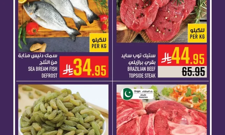 عروض ابراج هايبر ماركت الخميس 23 أكتوبر 2025 تقدم مجموعة من الفواكه الطازجة والعصائر الطازجة بالإضافة إلى منتجات جوز الهند والعروض الخاصة للرمان اليمني و تشمل أيضا على اختيارات واسعة من الأسماك واللحوم والأجبان الشهية حيث تتوفر أنواع الأسماك مثل دنيس البحر وباراكودا بالإضافة إلى اللحوم البرازيلية