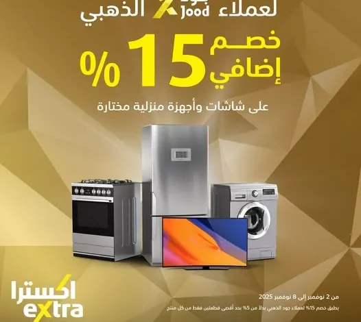 عروض اكسترا السعودية خصم اضافي 15% على الأجهزة المنزلية لعملاء جود الذهبي من 2 حتى 8 نوفمبر 2025 لا تفوتوا هذه الفرصه المميزه