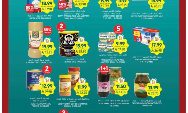 عروض التميمي الأسبوعية الأربعاء 31/12/2025 الموافق 11 رجب 1447هـ تشمل الأرز المصري والمعكرونة والعدس والحمص الحب وزيت عباد الشمس وصلصة الفلفل و بتوفر كمان بمناسبة شهر رمضان الكريم 1447هـ تشكيلة من الاجهزة المنزلية مثل خلاط عصائر ومفرمة كهربائية وسخان خبز كهربائي وفرن و مجموعة من الادوات الضرورية لتحضير الطعام .