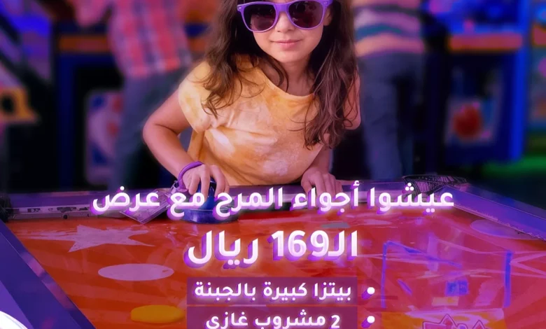 - عروض بـ 169 ريال فقط بيتزا كبيرة بالجبنة + 2 مشروب غازي + 100 نقطة لعب وطفلين مجانًا للألعاب الحركية