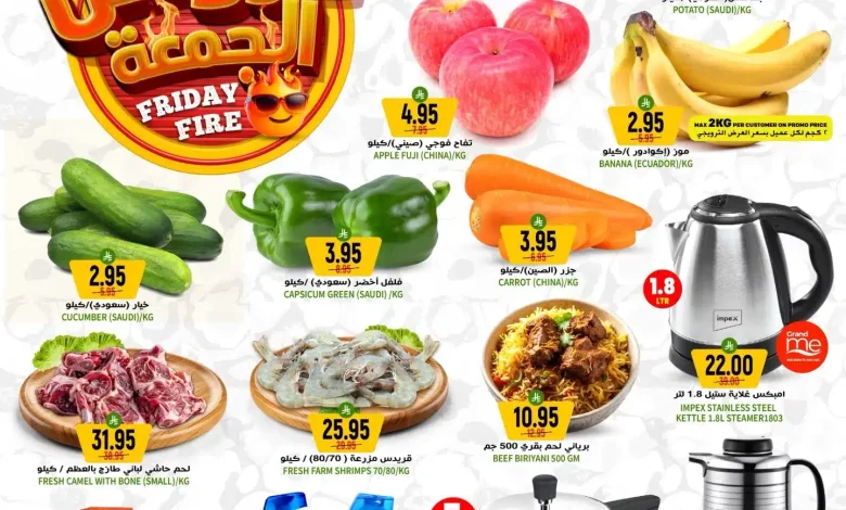 تحتوي عروض جراند هايبر الرياض علي : بصل – بطاطس – تفاح فوجي – موز – خيار – فلفل أخضر – جزر – غلاية ستيل ايمبكس – لحم حاشي طازج بالعظم – قريدس مزرعة – برياني لحم بقري – كولونيا جوفان وايت مسك – شامبو هيد اند شولدرز – قدر ضغط ايمبكس – ترمس بازيوت – حليب طازج