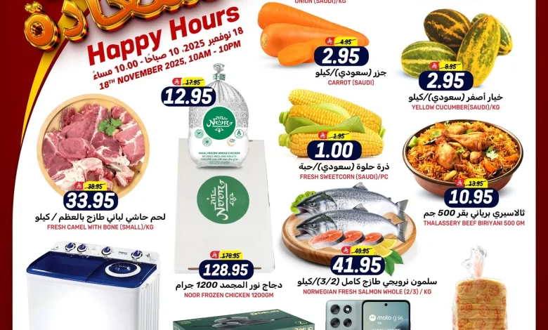عروض جراند هايبر الرياض الطازج الثلاثاء 18 نوفمبر 2025 تقدم لكم افضل المنتجات الغذائية التي تضم اشهي الفواكه و الخضروات الطازجة منها بطيخ سعودي و بصل و خيار اصفر و ذرة حلوة بالاضافة الي جراند خبز الحليب و سملون نرويجي طازج كامل و غيرها من المنتجات و باقل الاسعار تابعونا ليصلكم كل جديد علي موقعكم عروض توداي