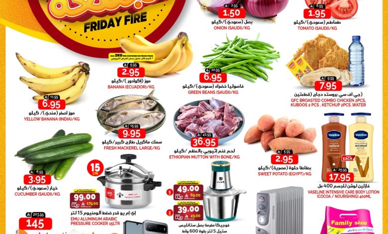 عروض جراند هايبر الرياض الطازج الجمعة 28 جماد الاخر 1447هـ بتحتوي علي منتجات متنوعة طماطم سعودي و بصل و فاصوليا خضراء و سمك ماكريل طازج و بتشمل كمان موز اصفر و خيار و بطاطا مصرية و لحم غنم الاثيوبي و غيرها من المنتجات و باقل الاسعار المناسبة للجميع في عرض حصري متاح اليوم فقط