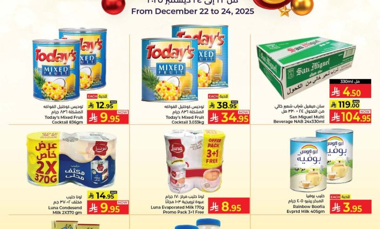 عروض كابايان ماركت جدة اليوم الاثنين 22 ديسمبر 2025 و تحتوي علي عبوات كوكتيل الفواكه المتنوعة والحليب المبخر والمكثف والقشطة والكريمة الى جانب المايونيز ومجموعة من منتجات الحليب البودرة و بتوفر كمان بدة الفول السوداني والصلصات المتنوعة ومعكرونة البهون والبانسيت والجيلاتين ومشروبات جوز الهند