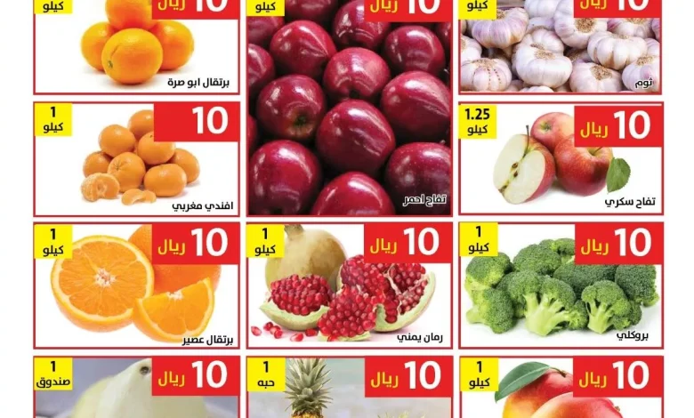 نستعرض معاكم احدث عروض مؤسسة حصاد البساتين الجمعة 5 ديسمبر 2025 وتحتوي علي التفاح بأنواعه والكمثرى والعنب الأحمر والأخضر والأسود إضافة إلى الكيوي والكاكا الإسباني والبطيخ الدائري والطويل مع إبراز ثمار أخرى مثل الأناناس والمانجو والبرتقال بأنواعه وغيرها من المنتجات و باقل الاسعار المناسبة للجميع .
