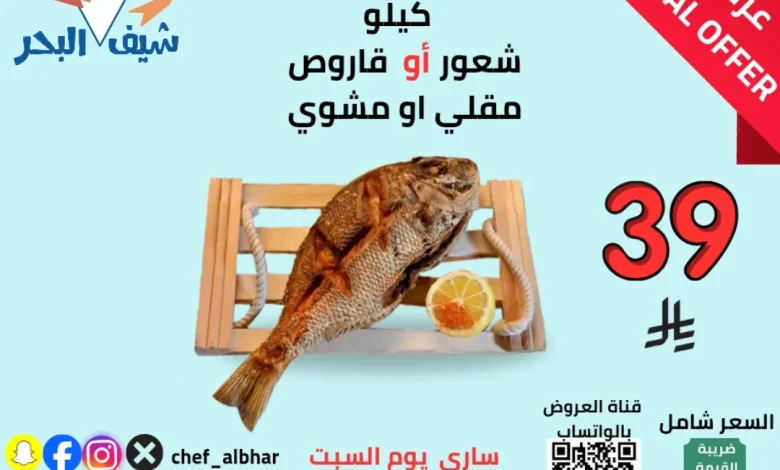 عروض مطعم اسماك شيف البحر ساري يوم السبت 11 اكتوبر 2025 على اشهى انواع السمك شعور او قارص بسعر مميز