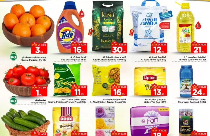 عروض نستو الدمام السبت 14-2-2026 الموافق 26 شعبان 1447هـ و تحتوي علي اليوسفي والطماطم ولحم الجمل وسمك الكنعد وأرز البسمتي وزيت عباد الشمس بجانب منظفات ومستلزمات عناية شخصية