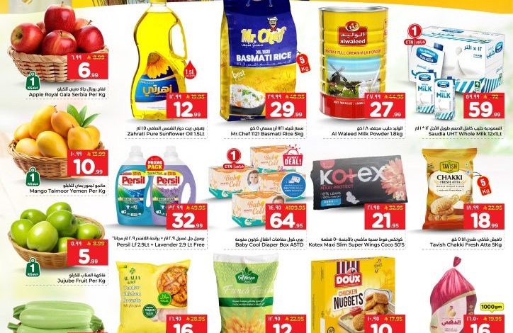 عروض نستو الدمام الجمعة 6 فبراير 2026 الموافق 28 شعبان 1447هـ و تحتوي علي التفاح الأحمر والمانجو والفاكهة الموسمية والكوسة والمشروم والثوم والزنجبيل كما تتوفر زيوت الطبخ والأرز البسمتي وحليب البودرة والحليب