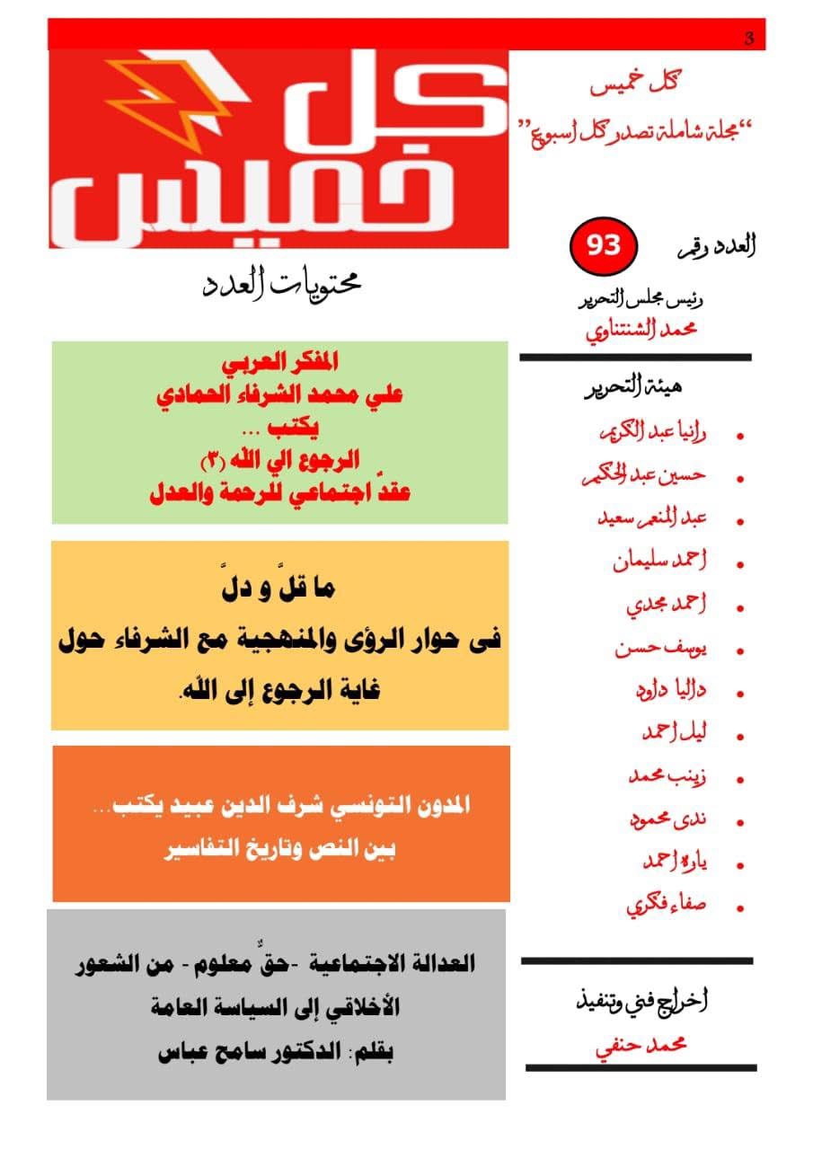 الجدير بالذكر انه يرأس مجلس تحرير مجلةكل خميسالكاتب الصحفي والباحث محمد الشنتناوى
