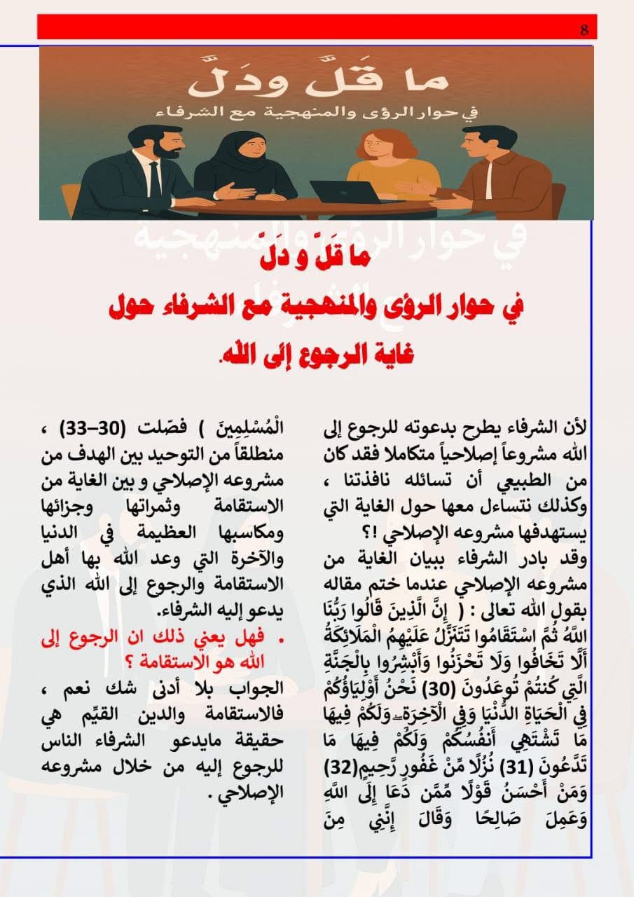 وجاء العدد في سياق حواري يجمع بين الفكر والتطبيق ، وتضمن في مقالاته نقاشات حول معاني حرية الاعتقاد، والعدالة الاجتماعية، ومسؤولية الإنسان عن أفعاله ، كما يتناول الملف كيف يمكن تحويلالرجوع إلى اللهمن حالة وعظية إلى مشروع إصلاحي متكامل يربط بين الدين والقانون والسياسة العامة، بحيث يصبح التدين طاقةً للإنصاف والبناء لا موسم عاطفي عابر .