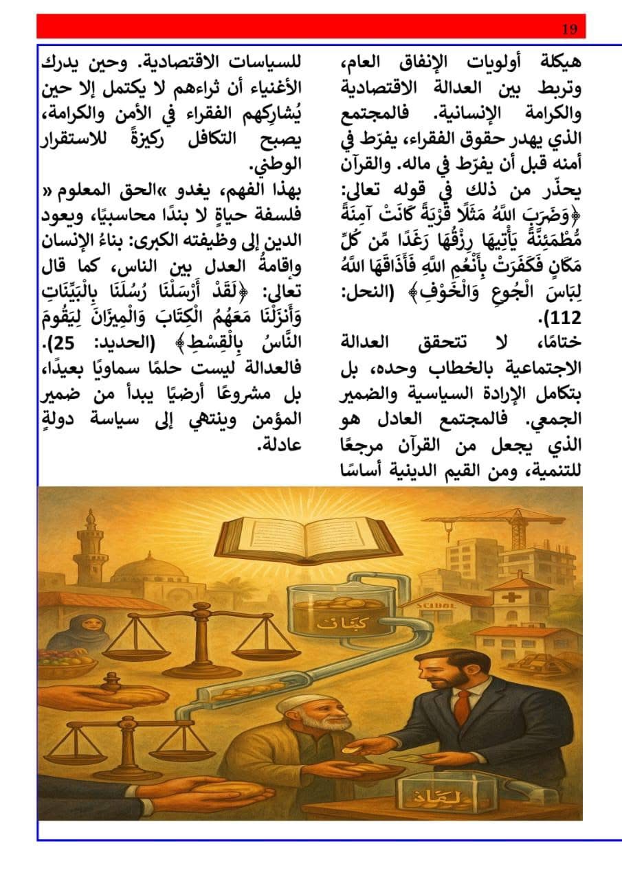 ويمتد الخط الفكري للعدد إلى تناول العدالة الاجتماعية بوصفهاحق معلوم ” في ثروة الأمة، يدعو إلى سياسات اقتصادية عادلة ومنصات شفافة للزكاة والصدقات، وشراكات حقيقية بين الدولة والمجتمع المدني والقطاع الخاص لمحاربة الفقر وتمكين الفئات المهمشة ، ويؤكد أن الإصلاح لا يتحقق إلا بتحويل الإحسان الفردي إلى نظامٍ مؤسسي مستدام يرسخ قيم العدل والمساواة .