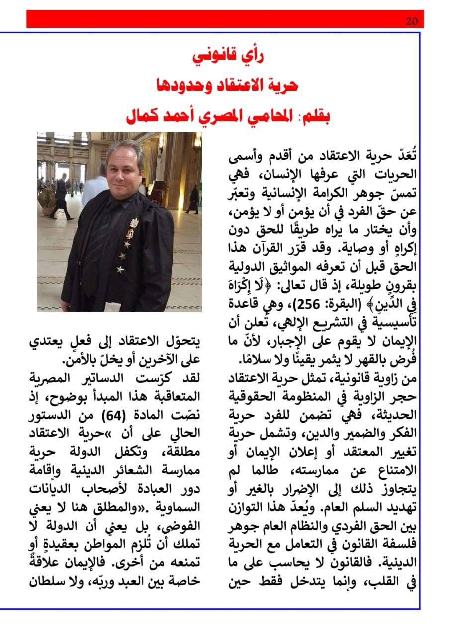 وفي إحدى قراءاته، يستعرض العدد العلاقة بين النص القرآني وتاريخ التفاسير، مبيّناً أن الهداية الإلهية واضحة في مقاصدها الكبرى، وأن العدل والرحمة والحرية هي الثوابت التي لا يحق لأحد أن يحتكر تفسيرها أو يصادرها ، كما يتناول مفهوم حرية الاعتقاد كحق إنساني ودستوري لا يقبل الانتقاص، مؤكداً علي أن حماية السلم العام لا تعني مصادرة الضمير أو تقييد الفكر، وأن الإيمان لا يُفرض بالقوة بل يُختار عن وعيٍ وحرية .