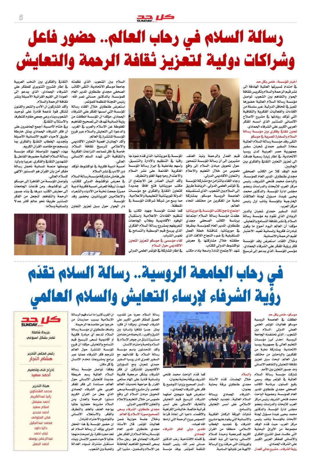 وشهد العدد تغطية خاصة للمشاركة المتميزة لوفد مؤسسة رسالة السلام العالمية في فعاليات المؤتمر العلمي الدولي ” السلام بين الشعوب ” والذي استضافته الجامعة الروسية، حيث قدّم الوفد عدد من الأوراق البحثية التي أبرزت جهود المؤسسة في تعزيز قيم التعايش والسلام العالمي .