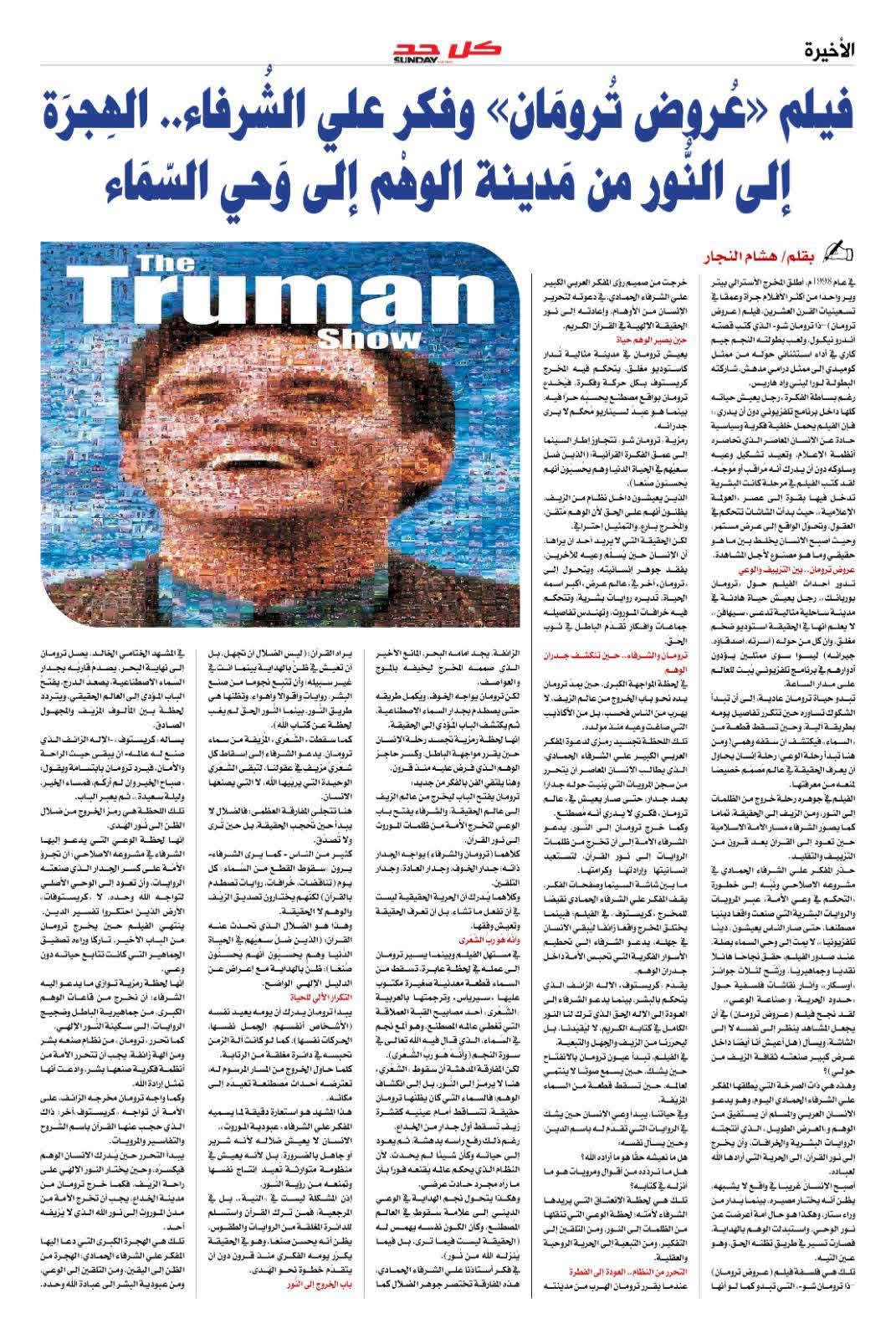 وفي الصفحة الأخيرة، قدّم رئيس مجلس التحرير الكاتب الصحفي هشام النجار مقال نقدي تحليلي بعنوان ” فيلم عروض ترومان وفكر علي الشرفاء .. الهجرة إلى النور من مدينة الوهم إلى وحي السماء ” ، ربط فيه بين الرسالة الإنسانية للفن ورؤية المفكر علي الشرفاء في الدعوة إلى وعي جديد يعيد للإنسان توازنه الروحي والفكري .