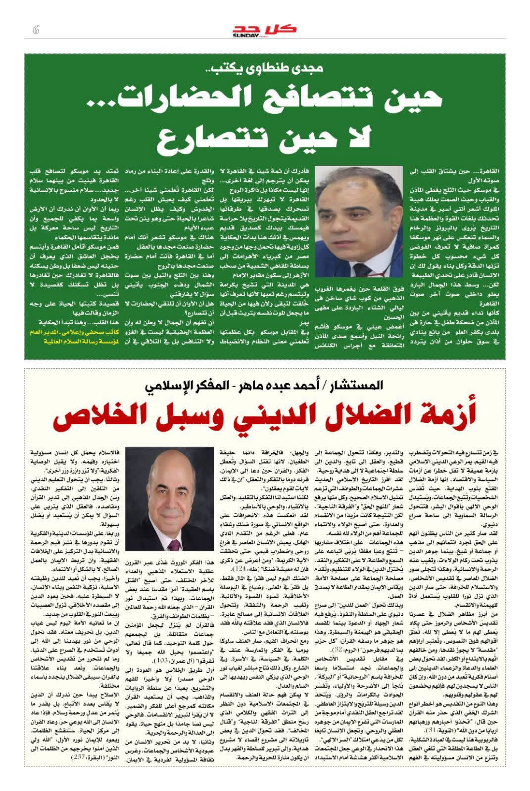 كما نُشر في العدد مقال تحليلي نوعي للكاتب الصحفي مجدي طنطاوي، المدير العام لمؤسسة رسالة السلام، تحت عنوان ” حين تتصافح الحضارات .. لا حين تتصارع ” دعا فيه إلى ترسيخ قيم الحوار والتفاعل الحضاري بين الأمم بدلاً من منطق الصدام والتناحر .
