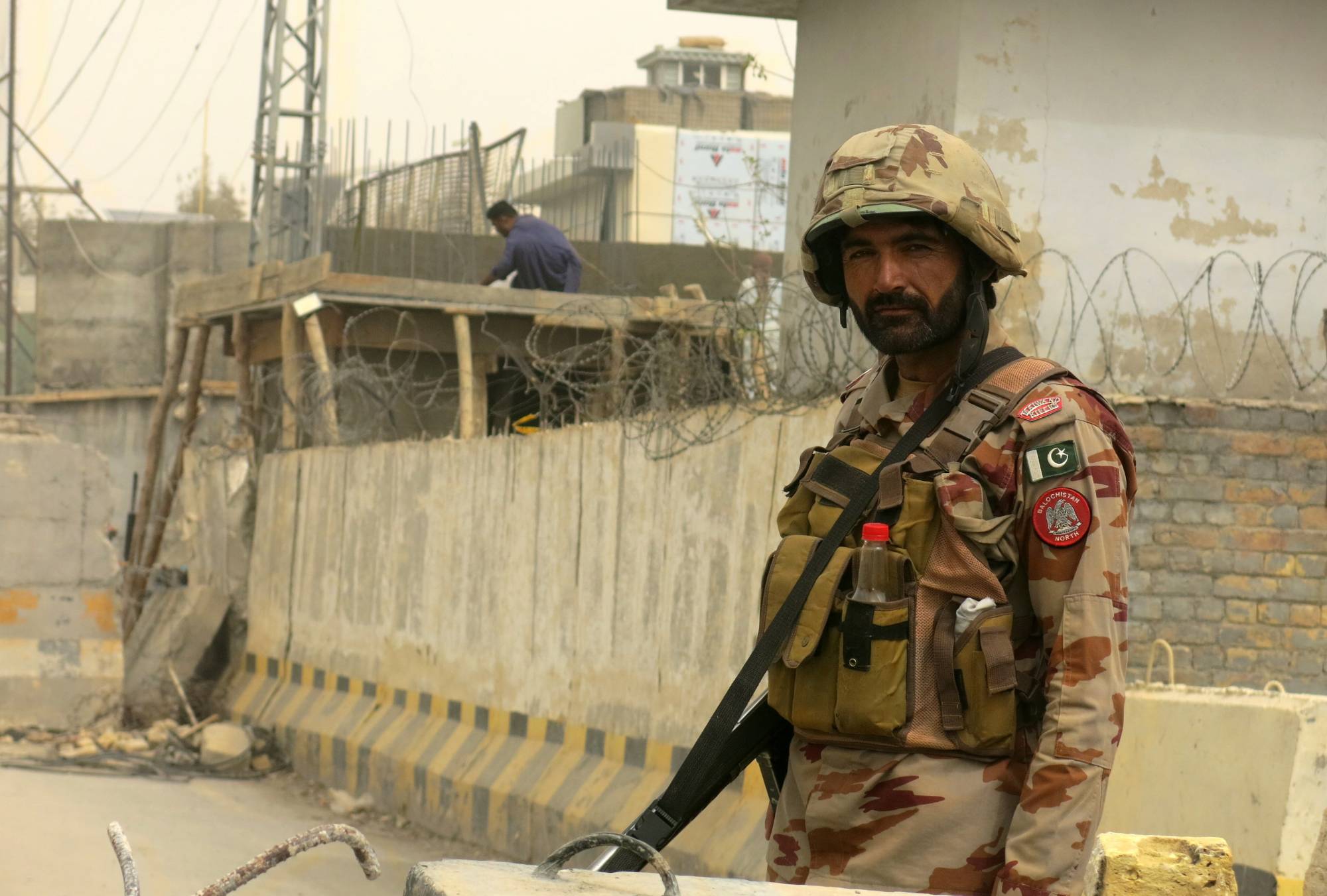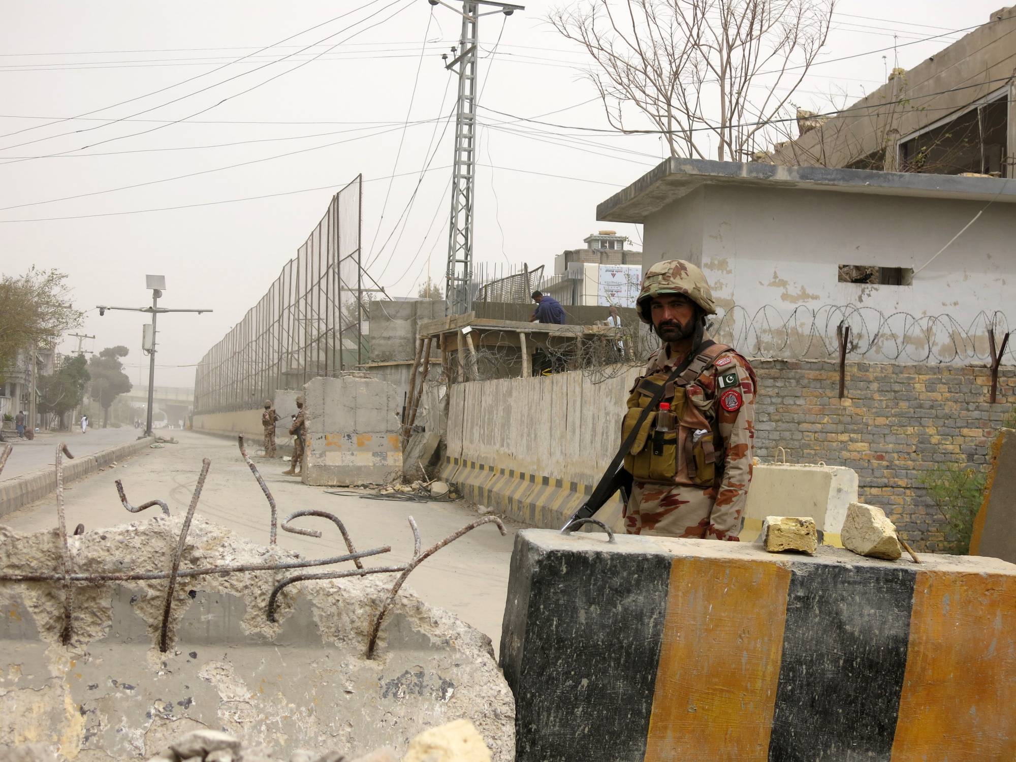 جنود شبه عسكريين من فيلق الحدود يقفون حراساً بينما يُصلح العمال الجدار الحدودي الذي تضرر بتفجير انتحاري في كويتا عاصمة إقليم بلوشستان المضطرب بباكستان الاثنين (إ.ب.أ)
