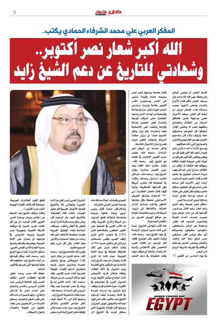 ويعد مقال علي الشرفاء مقال استثنائي يسجل فيه الكاتب شهادة تاريخية موثّقة عن الدور القومي والريادي للمغفور له الشيخ زايد بن سلطان آل نهيان في دعم مصر خلال معركة أكتوبر 1973، سياسياً واقتصادياً ومعنوياً، في لحظة مفصلية من التاريخ العربي .