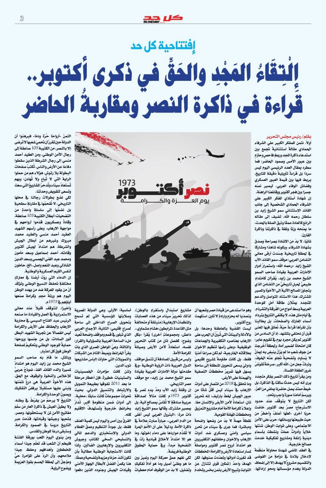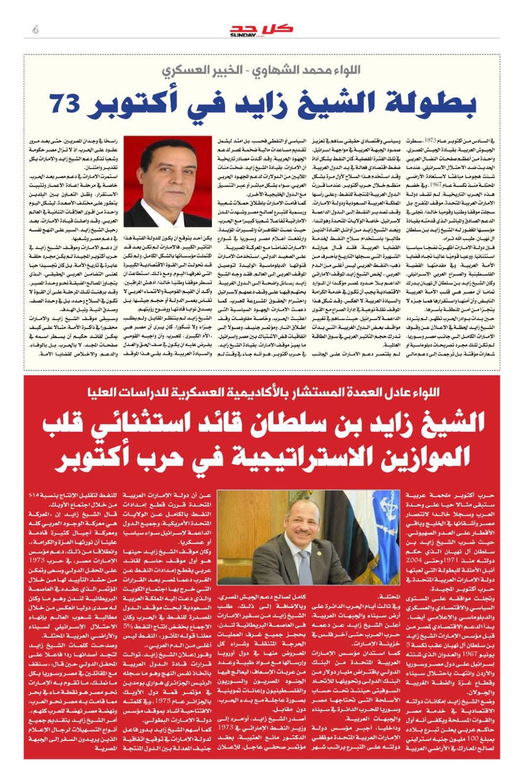 كما تضمن العدد مقال رئيسي للمفكر علي الشرفاء الحمادي تصدر العدد مقال المفكر العربي الكبير الأستاذ علي الشرفاء الحمادي، بعنوان : الله أكبر شعار نصر أكتوبر .. وشهادتي للتاريخ عن دعم الشيخ زايد ” .