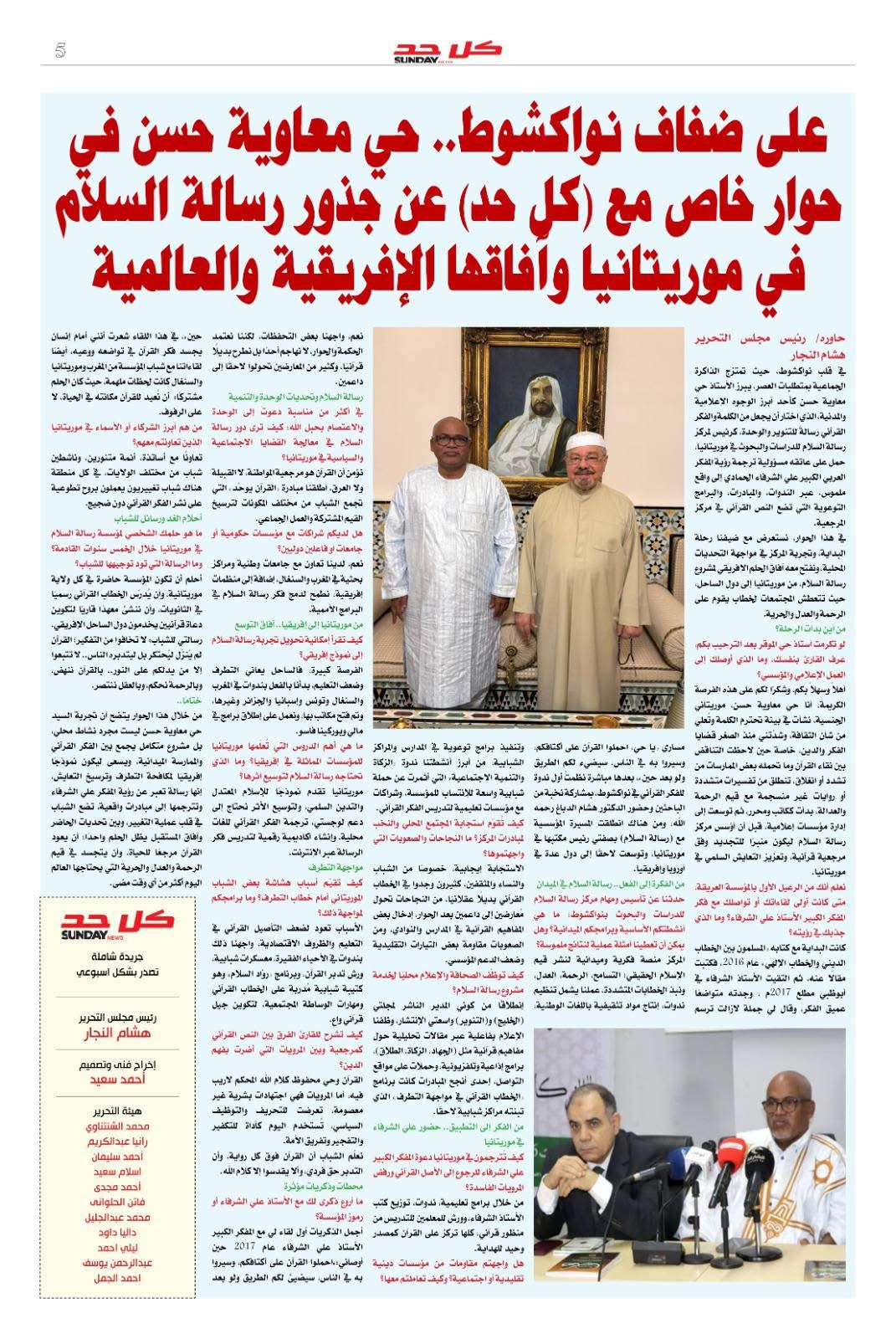 وضمن صفحات العدد، نُشر حوار خاص وثري مع السيد حي معاوية حسن، أحد رموز الرعيل الأول في مؤسسة رسالة السلام، وممثلها في موريتانيا، تناول فيه رؤيته لرسالة المؤسسة وأولوياتها في إفريقيا.