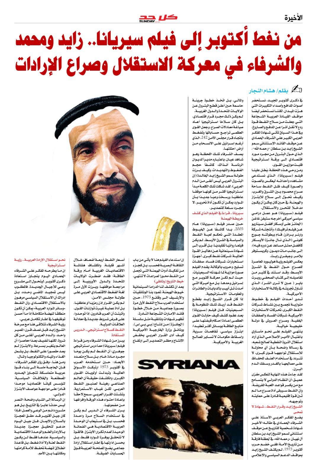 وفي ختام العدد، نشرت المجلة مقال تحليلي نقدي لافت للكاتب الصحفي هشام النجار، بعنوان : من نفط أكتوبر إلى فيلم سيريانا.. زايد ومحمد والشرفاء في معركة الاستقلال وصراع الإرادات ،