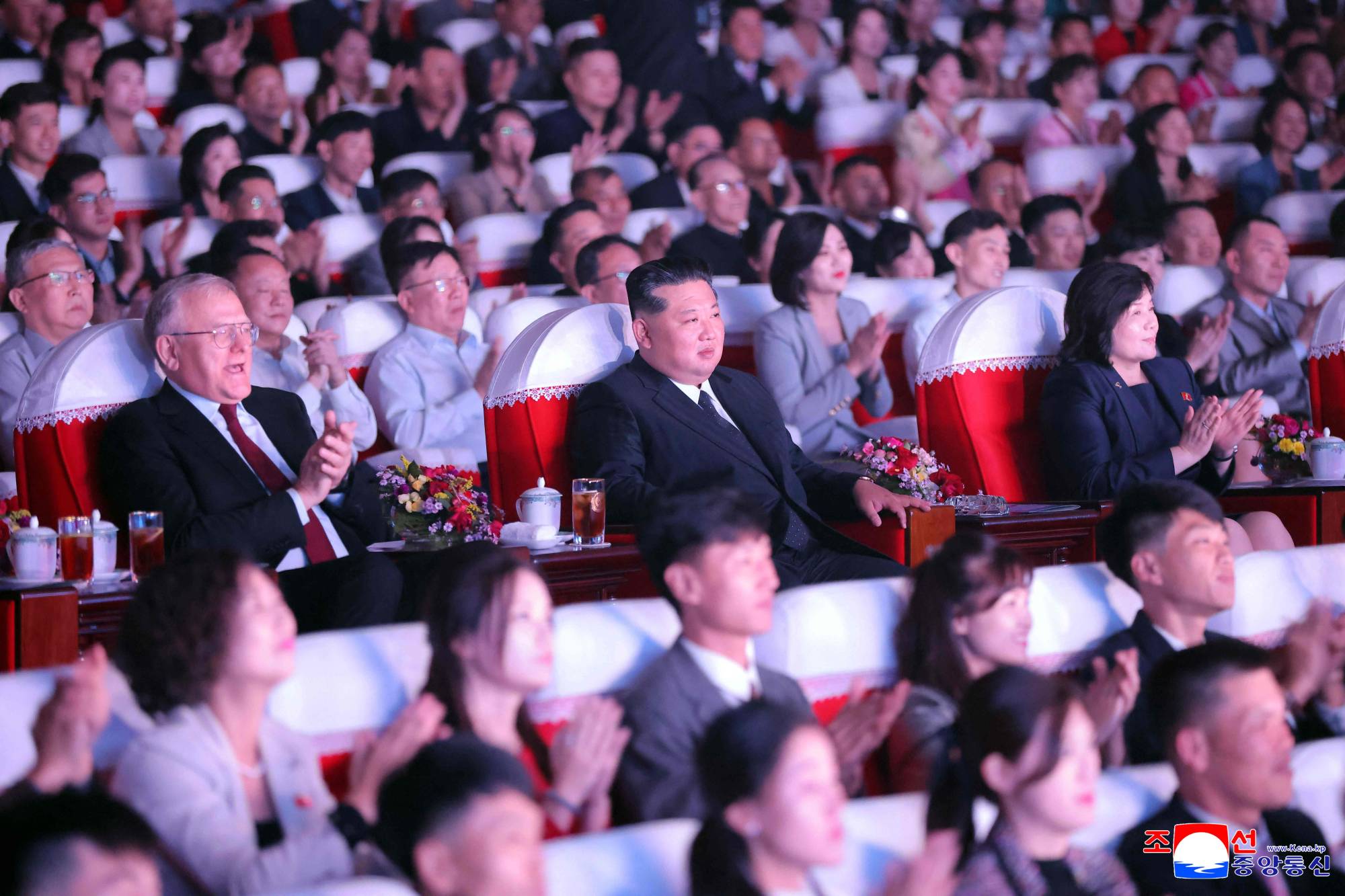 زعيم كوريا الشمالية كيم جونغ أون (وسط) يشاهد عرضاً قدّمه فنانون روس احتفالاً بالذكرى الثمانين لتأسيس حزب العمال الكوري في مسرح مانسوداي للفنون في بيونغ يانغ (أ.ف.ب)