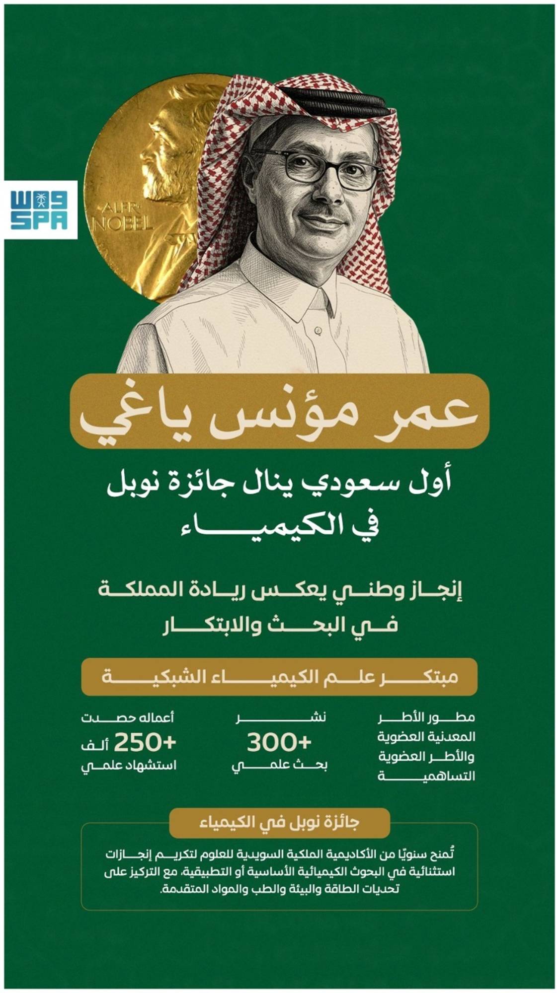 تُوِّج البروفسور عمر ياغي، بجائزة نوبل في الكيمياء لعام 2025 المقدمة من الأكاديمية الملكية السويدية للعلوم، بصفته أول عالم سعودي يفوز بها، تقديراً لإسهاماته الريادية في تأسيس علم الكيمياء الشبكية، وتطوير الأطر المعدنية العضوية، والعضوية التساهمية، التي أحدثت ثورة في علوم المواد، وفتحت آفاقاً جديدة لتطبيقات الطاقة النظيفة والمياه والبيئة.