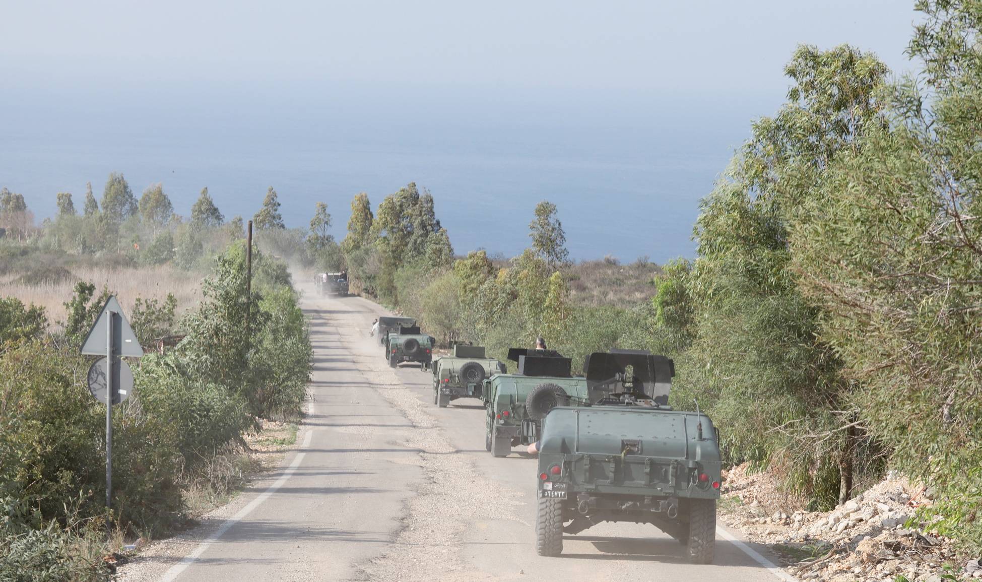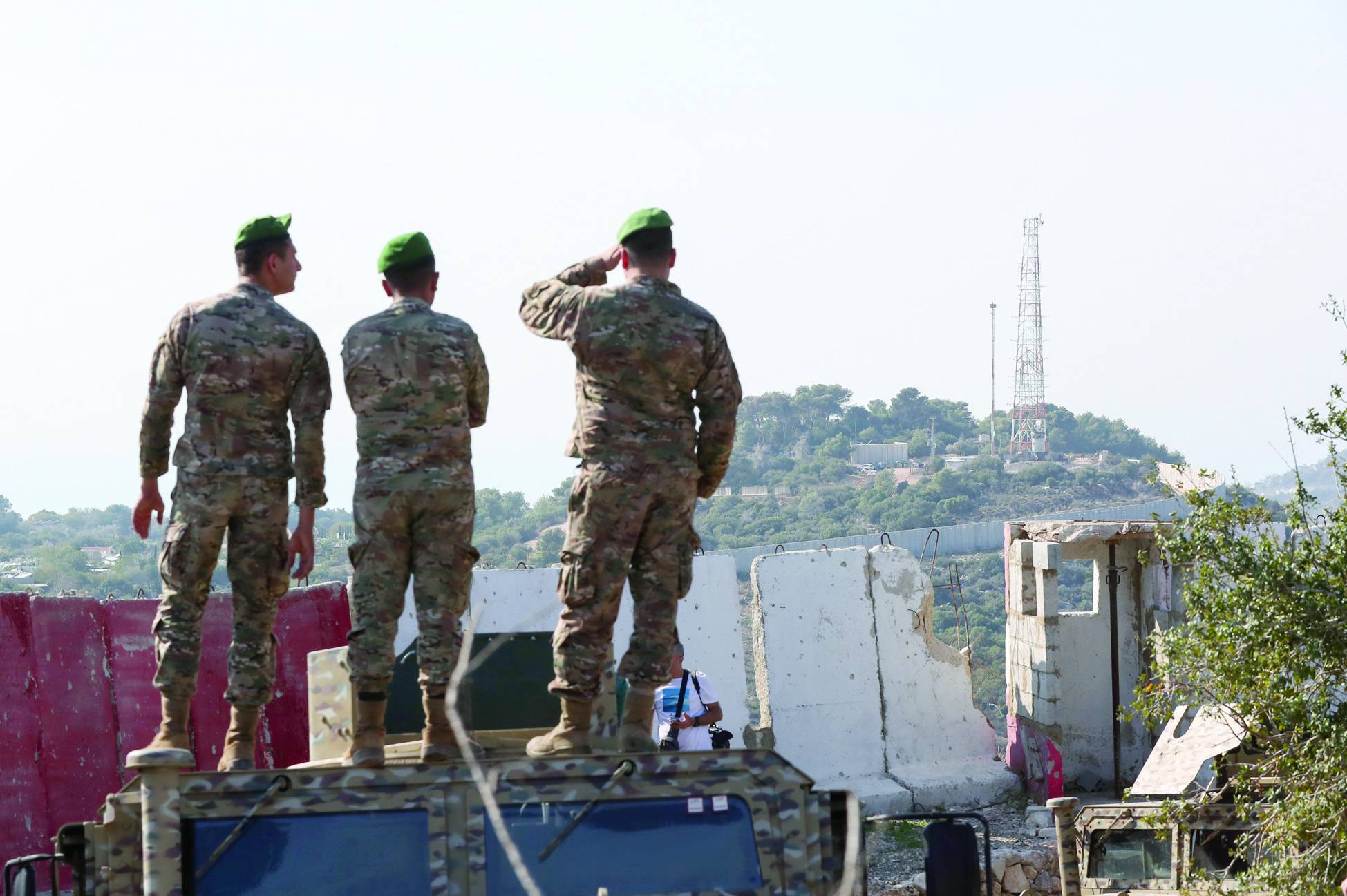 جنود لبنانيون يقفون على آليتهم مقابل موقع حانيتا الإسرائيلي المواجه لبلدة علما الشعب بجنوب لبنان نوفمبر الماضي (إ.ب.أ)