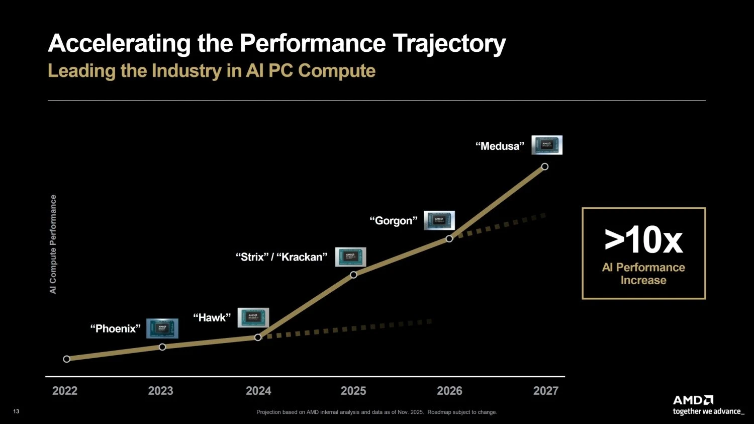 من المنتجات التي تخطط AMD للعمل عليها هي معالجات APU من الجيل الجديد المدمج فيها كارت رسومي من معمارية RDNA 5 وقدرات ذكاء اصطناعي متقدمة. إذ يُتوقع أن يُطلق الجيل الجديد بالإسم الرمزي Gorgon في عام 2026 يليه Medusa في عام 2027.