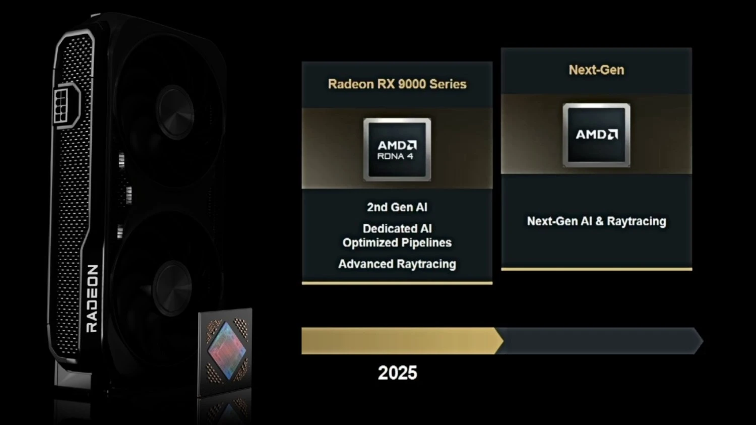 وقد أشار مارك بيبرماستر، المدير التقني لشركة AMD، إلى أن الهدف من تطوير الجيل القادم هو حصولنا على كروت رسومية ترتقي بمستوى تتبع الأشعة نحو الأفضل، وفي الوقت نفسه تحسين تجربة الذكاء الاصطناعي. فلقد ذكر ضمن حديثه تقنية FSR 4 الحالية المدعومة بالذكاء الاصطناعي، والمقتصرة حاليًا على سلسلة كروت Radeon RX 9000، باعتبارها تقنية مغيّرة لقواعد اللعبة فيما يخص تحسين دقة الصورة ورفع مستوى الأداء.