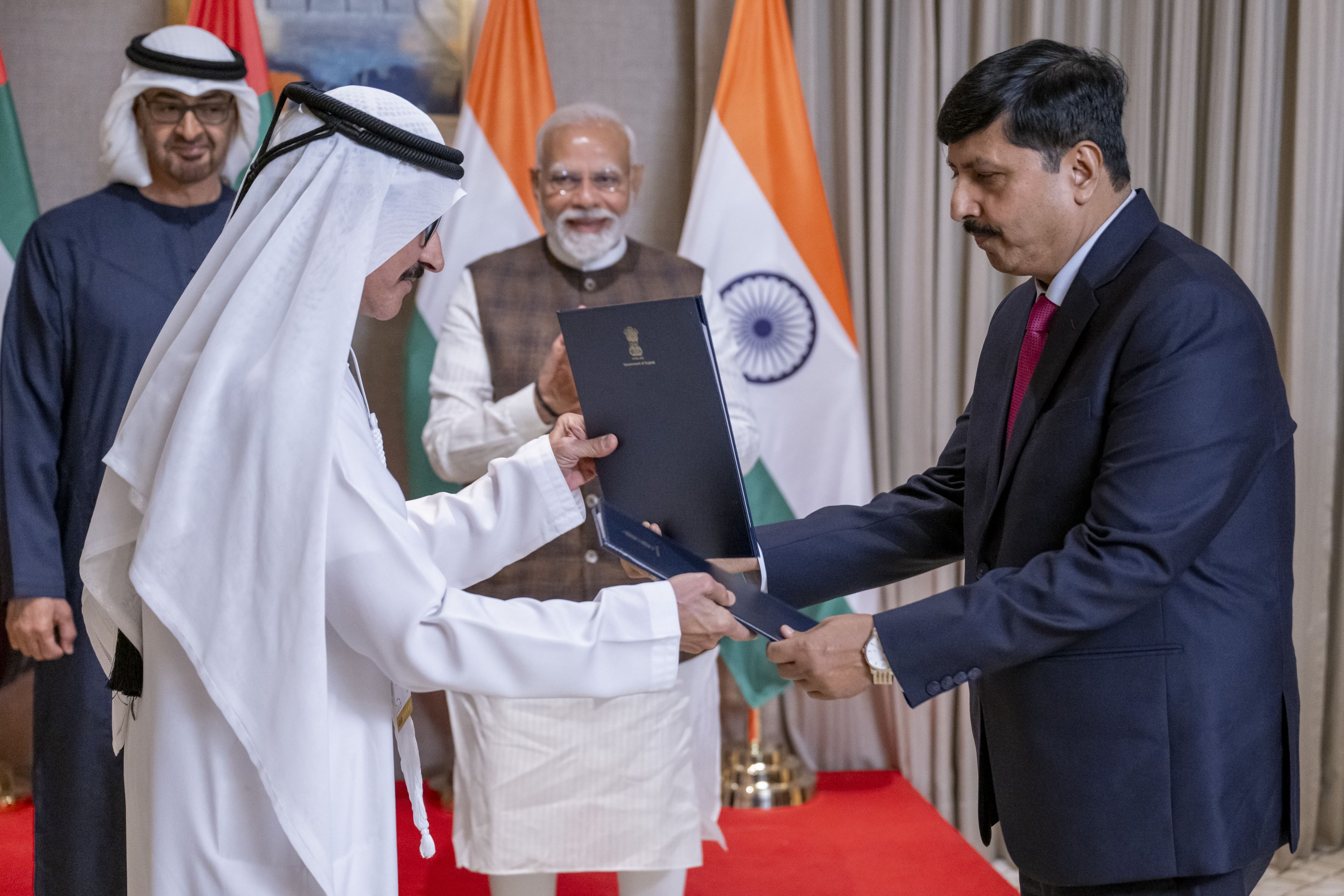 تبادل مذكرات التفاهم من جانب دولة الإمارات معالي محمد حسن السويدي وزير الاستثمار وسعادة سلطان أحمد بن سليم رئيس مجلس الإدارة الرئيس التنفيذي لمجموعة موانئ دبي العالمية. ومن الجانب الهندي معالي الدكتور سوبرامنيام جاي شانكار وزير الشؤون الخارجية، ومعالي الدكتور مانسوخ ماندافيا وزير الصحة ورفاهة الأسرة، ومعالي باشوباتي كومار باراس وزير الصناعات الغذائية، و راج كومار بينيوال نائب الرئيس والمدير التنفيذي في إدارة الخدمات الهندية.