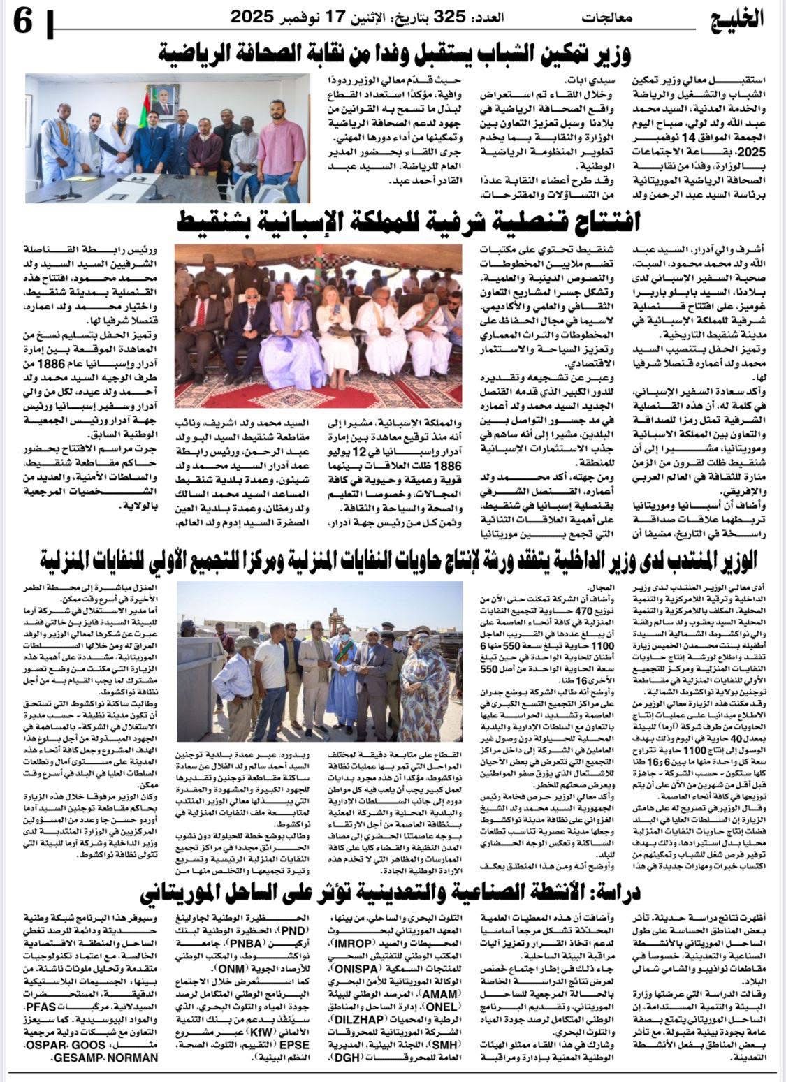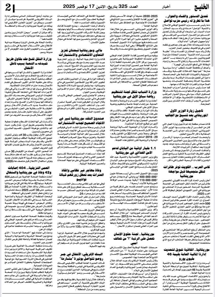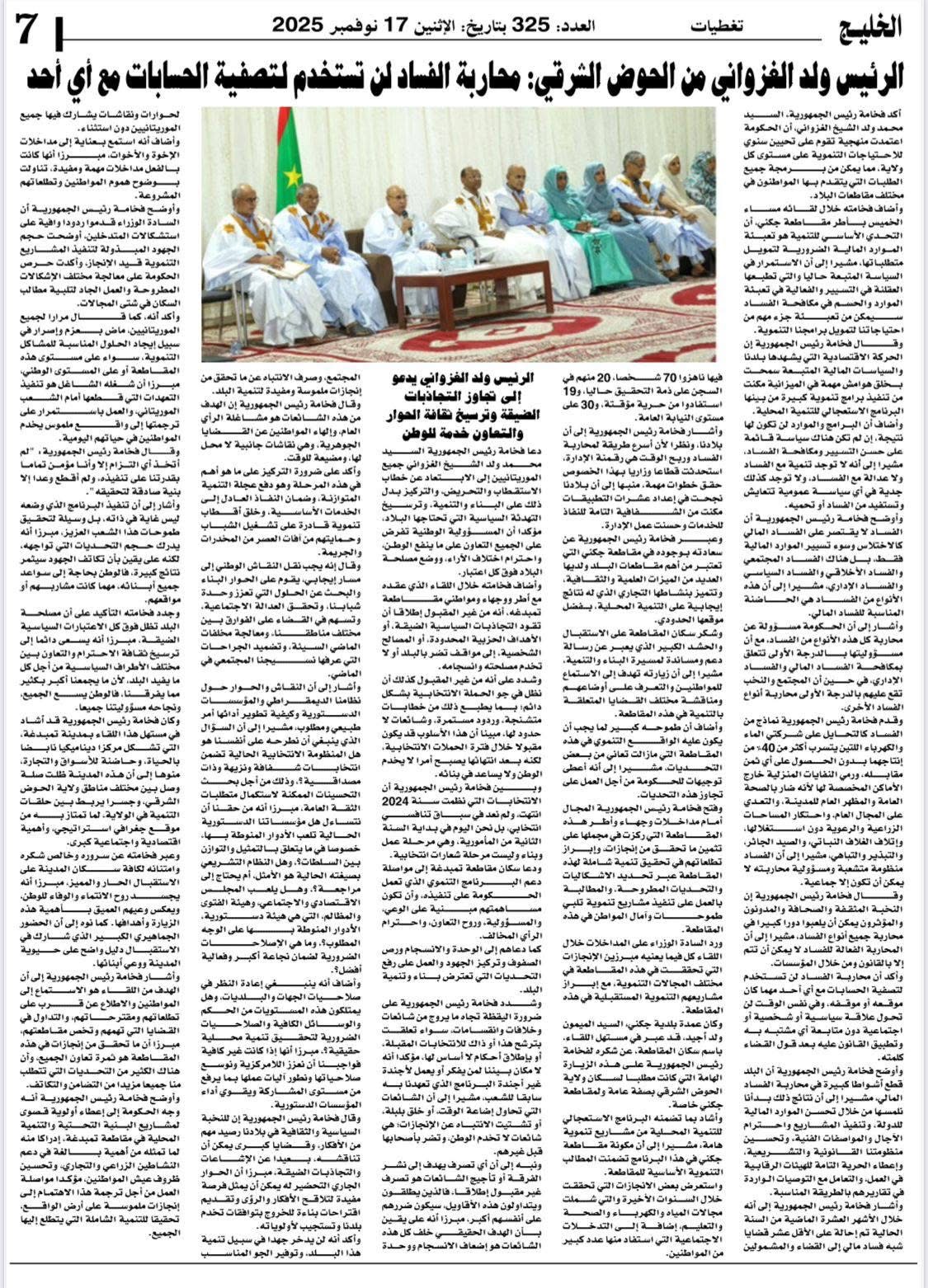 وفي سياق سياسي بارز، تضمّن العدد تصريحات للرئيس الموريتاني محمد ولد الغزواني الذي أكد أن مكافحة الفساد لن تتحول إلى وسيلة لتصفية الحسابات مع أي جهة، مشيراً إلى أن الدولة تعمل على إرساء منهج مؤسسي يحترم القانون ويضع مصلحة المواطن فوق أي اعتبار .
