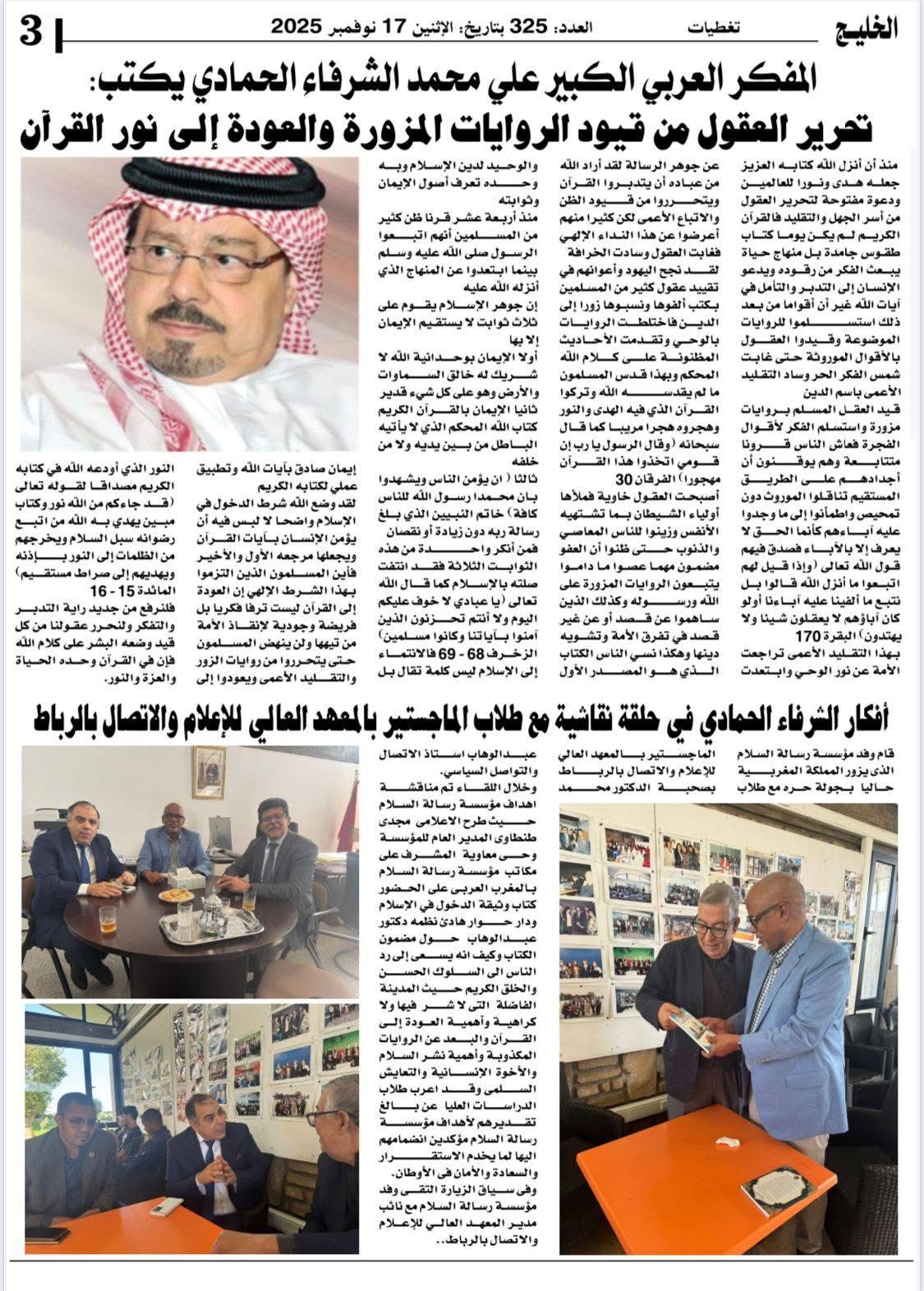 كما يتضمّن العدد تقرير موسع من الرباط حول حلقة نقاشية جمعت طلاب الماجستير في المعهد العالي للإعلام والاتصال، تناولت فكر علي الشرفاء الحمادي ومشروع مؤسسة ” رسالة السلام ” وتضمنت محاور النقاش : ” ضرورة إحياء قيم التسامح والتعايش السلمي .. نقد الفكر المتطرف وأثره على المجتمعات .. أهمية العودة إلى القرآن كمرجع للقيم الإنسانية المشتركة ” .