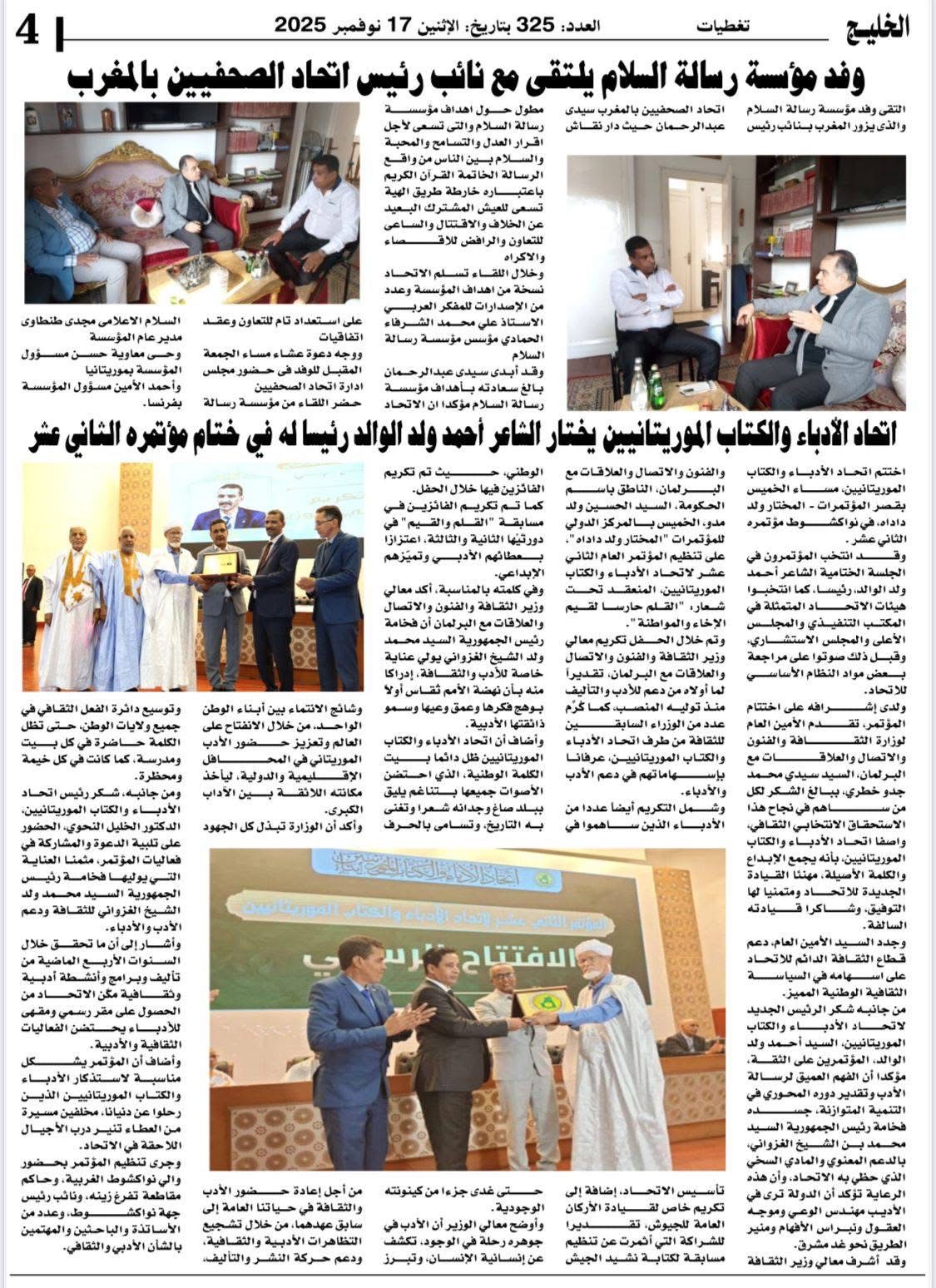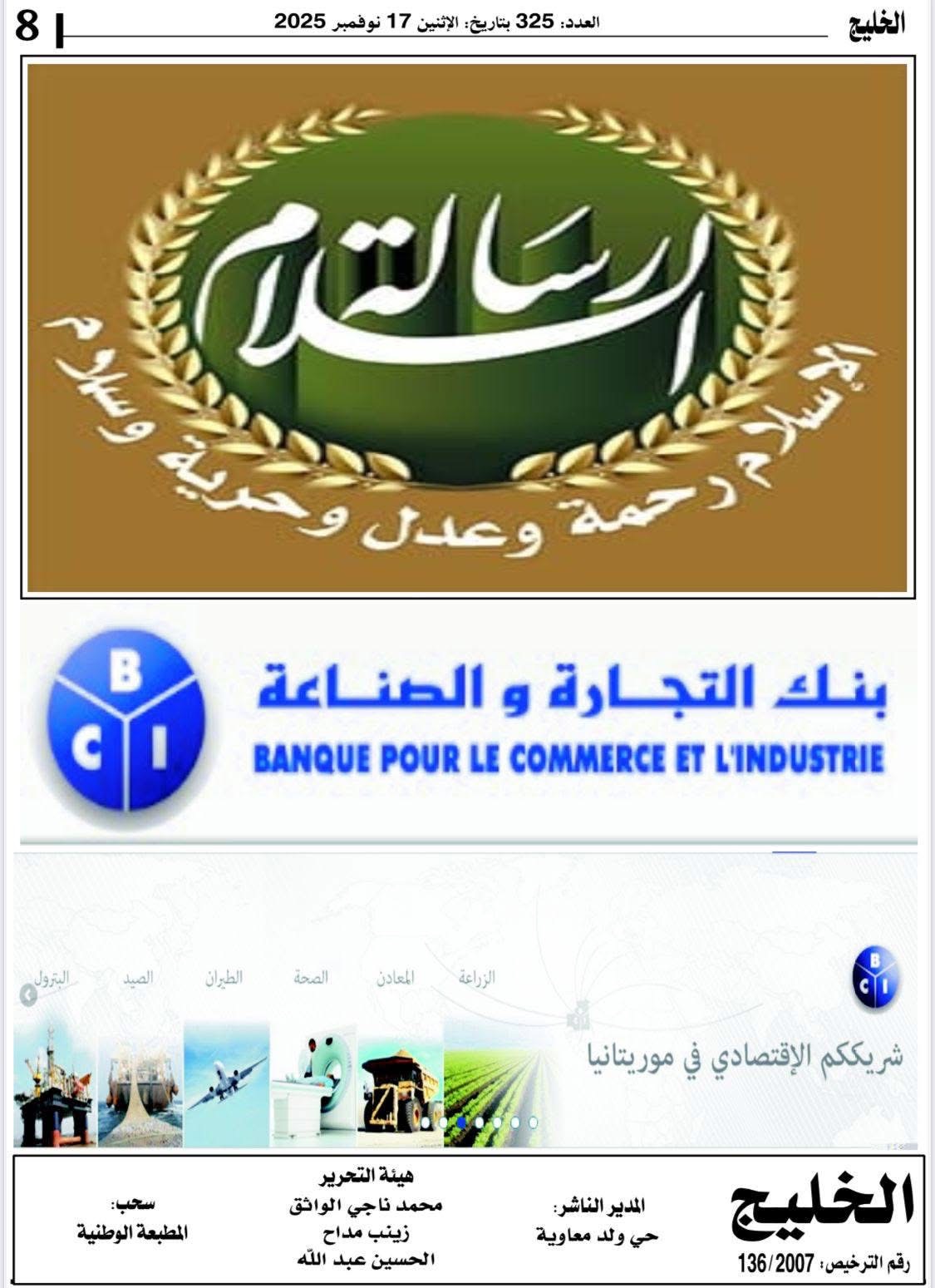 أصدرَت جريدة ” الخليج ” الموريتانية عددها الجديد، والذي جاء غنياً بالملفات الفكرية والتحليلات السياسية، متضمّناً مجموعة من المقالات التي تفتح نقاش واسع حول قضايا إصلاح الخطاب الديني، ومحاربة الفساد، وتعزيز قيم التعايش والسلام .