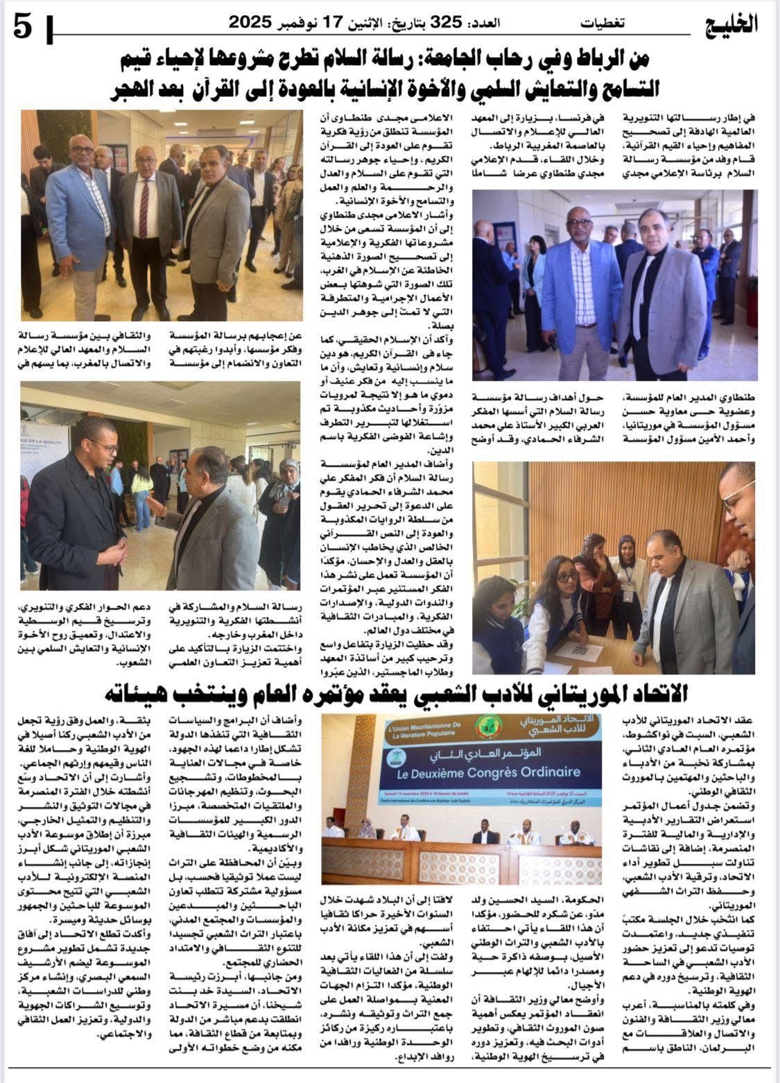 كما تضمن العدد تغطية للقاء جمع وفد مؤسسة “ رسالة السلام ” مع نائب رئيس اتحاد الصحفيين بالمغرب، حيث جرى بحث آفاق التعاون الإعلامي في مجال نشر خطاب معتدل، يدعم التنمية الفكرية ويحارب التطرّف، ويعزز الوعي الحضاري لدى الجمهور العربي .