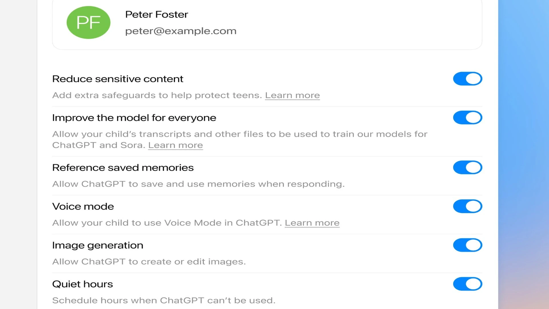 احتفظ بخيار اختيار تصفية (فلترة) المُحتوى الحساس والمُحتوى العنيف أو الإيحاءات الجنسية، فهذه من مفاتيح الرقابة الأبوية على ChatGPT التي تحمي المراهق من التعرض لمواد قد تؤثر على النفسية.