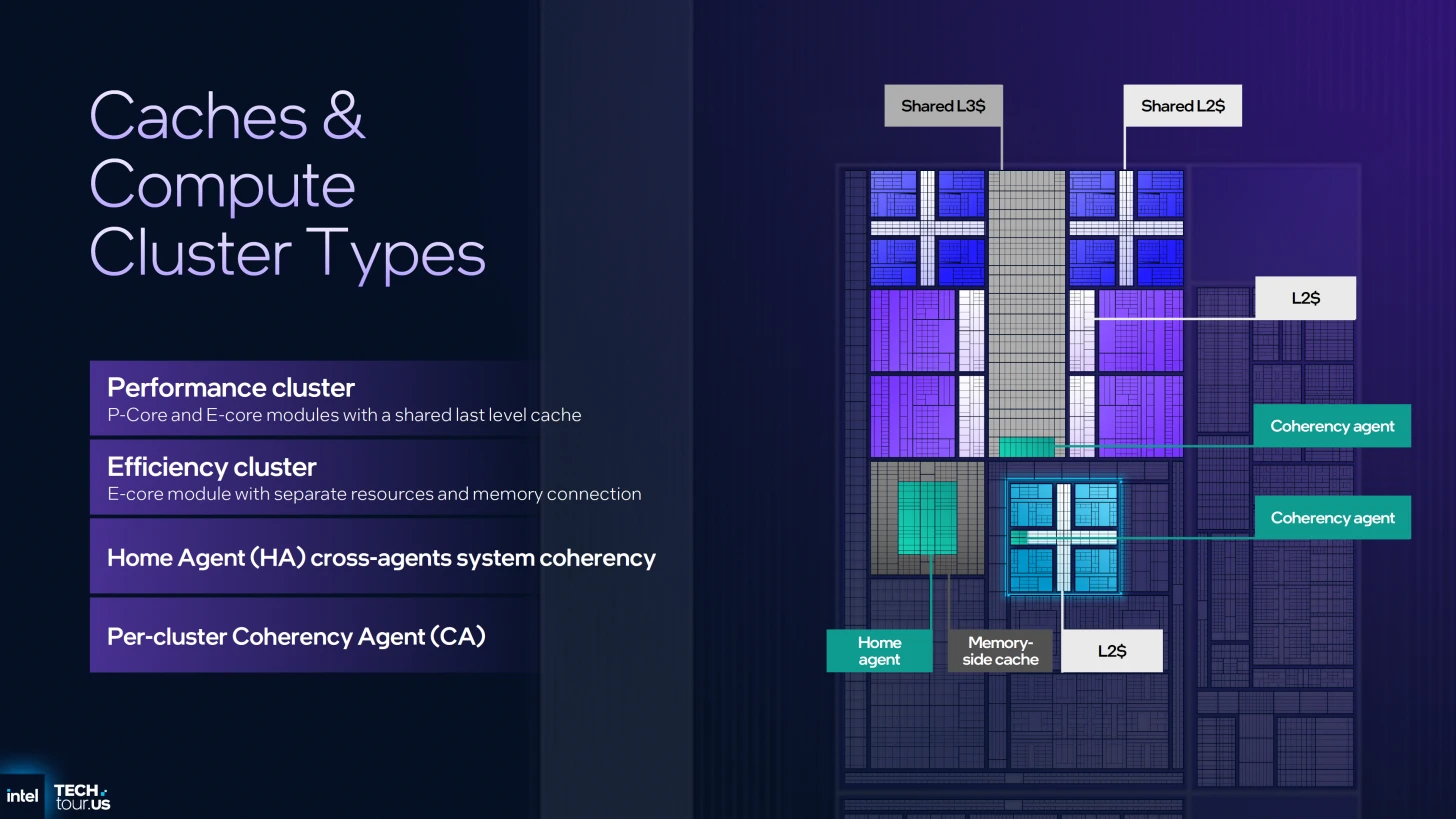 على عكس أنوية الأداء، تعتمد أنوية الكفاءة نظام التجمعات (Clusters)، حيث يتشارك كل تجمع في الموارد من المستوى الثاني من الذاكرة المخبأة L2 Cache: